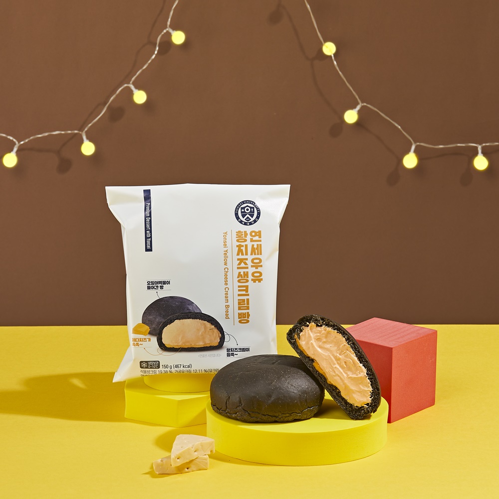 커스터드 크림에 옥수수 알갱이가 톡톡 ● 6탄 황치즈생크림빵 황치즈에 체다치즈를 섞어 한층 찐한 치즈 풍미와 오징어 먹물빵로 개성적인 비주얼 연출