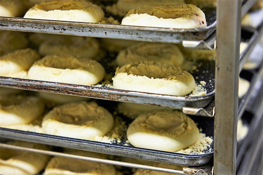 기계는 다시, 앙금을 품은 ‘공’을 납작하게 눌러줍니다. 거대한 매머드 발바닥처럼 두툼하고 큼직한, 전통의 맘모스빵 모양을 얻기 위해서라죠. 납작해진 반죽 위에 보슬보슬 소보로를 듬뿍 묻힌 후 발효실에서 2차 발효를 마치면 비로소 오븐의 시간이 시작됩니다.