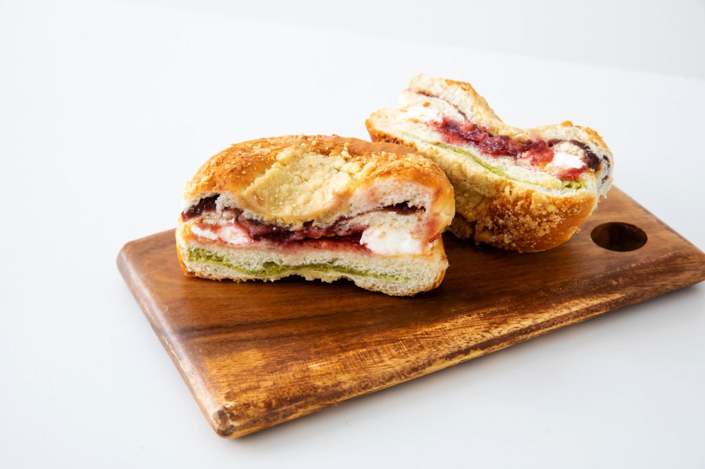 완두앙금빵 위에 크림과 딸기잼을 차례대로 듬뿍듬뿍 펴 바른 후 단팥앙금빵으로 덮습니다. 드디어 딸기잼 맘모스빵 완성! 반으로 슬라이스해 다채로운 단면을 뽐내는가 싶더니 이내 붉은 계열의 크림슨색 패키지에 쏙 자리를 잡습니다.
