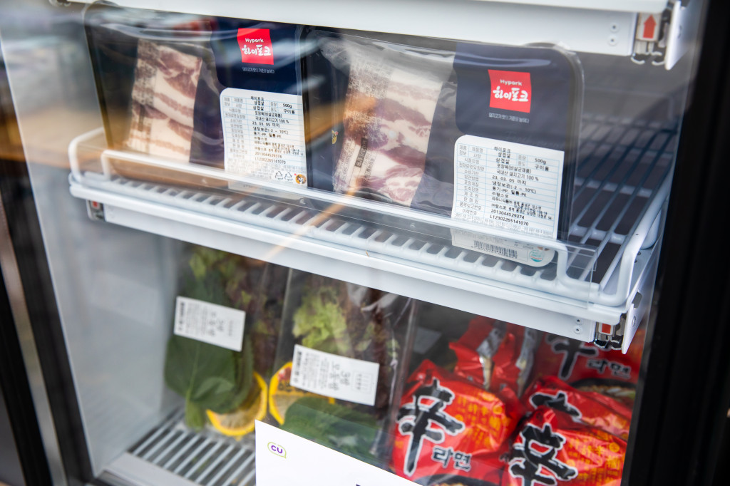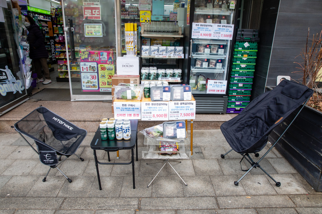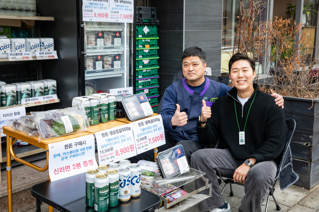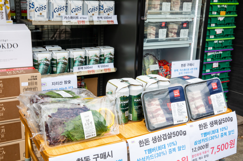 3월 3일 CU혜화한아름점이 분주합니다. 삼겹살 먹는 날 ‘삼삼데이’를 맞아 목살, 삼겹살 등 한돈 정육 기획전을 독특한 콘셉트로 꾸린 건데요. 미니 테이블, 캠핑용 의자, 석쇠까지 캠핑장을 그대로 옮겨놓은 연출이 단번에 시선을 사로잡습니다.