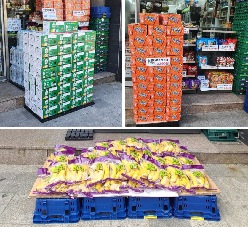 점두 판촉은 가격 경쟁력이 높은 제품 위주로 진행합니다. 상품성이 좋으면서 평소보다 할인 폭이 클 때 점포 앞을 지나가는 사람들의 눈길을 끌 수 있거든요. 시즌 상관없이 언제나 인기 있는 라면, 여름에는 음료처럼 수요가 많은 제품을 내세워 고객을 유입했습니다.