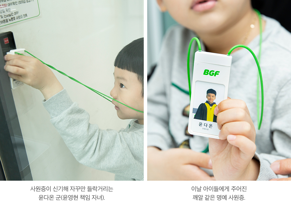 이번 가족맞이 행사는 서울 본사뿐 아니라 총 6개의 지역(경기남지역부, 강서지역부, 강원지역부, 동부산지역부, 충남지역부, 제주지역부)에서 열리는 등 대대적인 규모로 준비됐습니다. BGF LIVE는 그 중에서도 동부산지역부 스마트오피스로 향했는데요. 문을 열고 들어서니 벌써 고사리 손들이 이것저것 구경하느라 시끌벅적합니다. 누군가 “부모님은 무슨 일 하시니” 물어보면 자신 있게 “편의점이요!” 외친다는 귀여운 얼굴들. 어린이날을 하루 앞둔 오늘, 모처럼 엄마, 아빠와 함께 시간을 보낼 생각에 아이들의 눈빛이 초롱초롱 빛나고 있네요. 초등학교에 재학 중인 아이들도 학교에 체험학습을 신청한 뒤 부모님 회사로 함께 출근했다고 하는데요. 이날은 모처럼 시간을 낸 아이들에게 명예 사원증과 명함도 증정됐습니다. 출입 기능이 없는데도 사원증이 신기한지 자꾸 문을 들락거리며 출입 기능을 찍어봅니다.