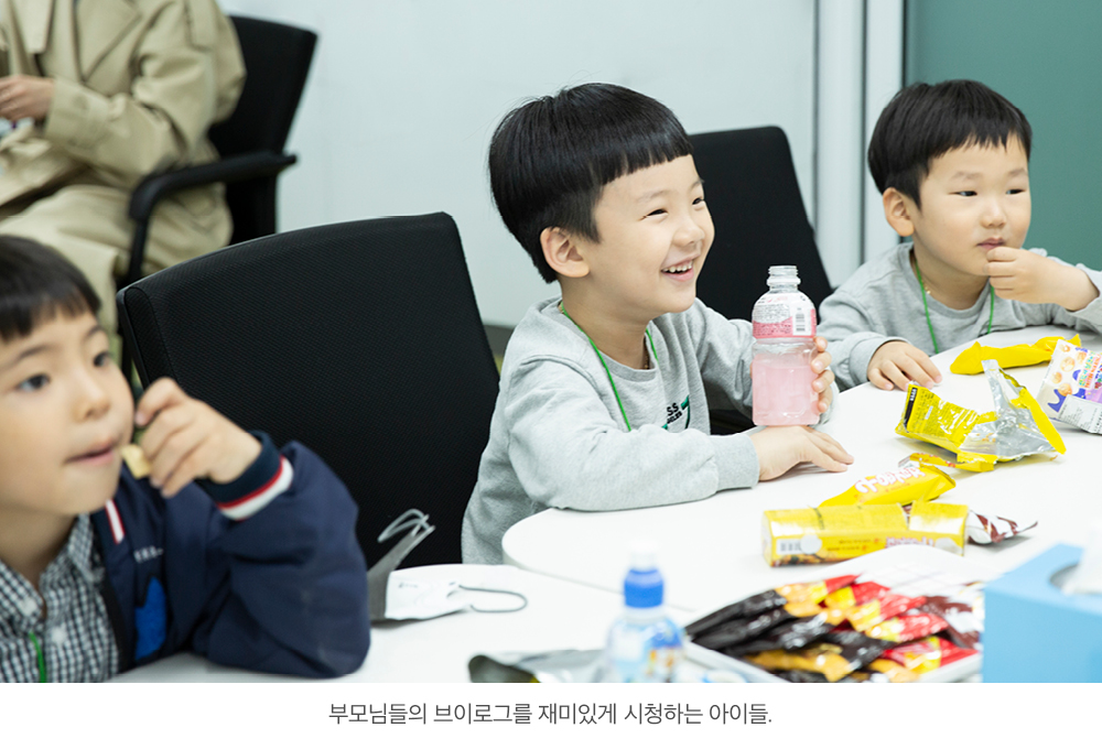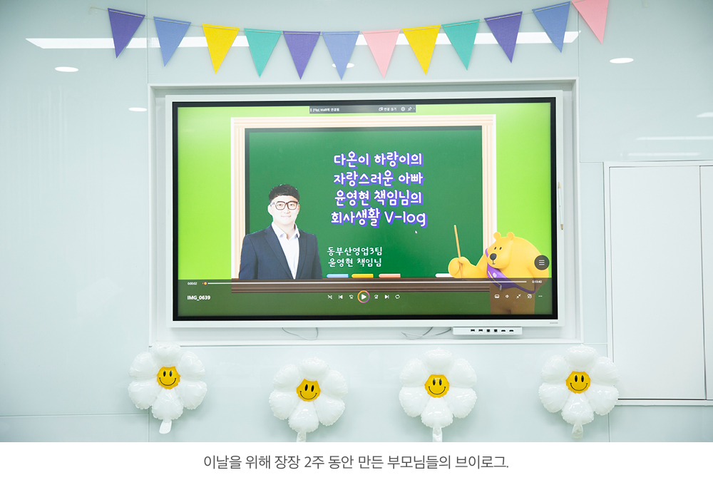 다음 프로그램은 부모님이 미리 찍어놓은 브이로그 감상하기. 아이들과 옹기종기 모여 엄마아빠가 근무하는 짬짬이 찍어둔 브이로그 영상을 관람했습니다. 직접 카메라를 들고 출근하는 모습, 각 편의점을 돌며 업무에 집중하는 모습 등 평소 아이들이 보지 못했던 엄마아빠의 하루가 스크린에 펼쳐집니다. 윤영현 책임, 남명기 책임, 이규화 책임, 황동학 책임, 김성욱 책임 모두 일하는 틈틈이, 무려 2주 동안 아이들을 위해 부모님의 업무를 보여주는 브이로그를 촬영했다는 후문입니다.