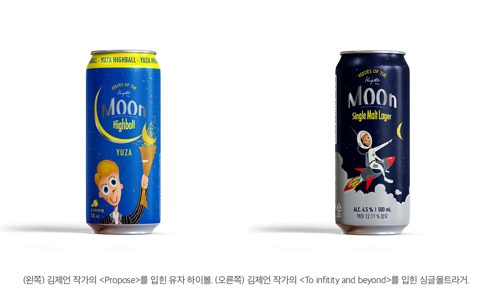풍류를 담은 CU와 프린트베이커리의 협업, 그 첫 번째 제품은 바로 청신 작가와 콜라보한 청신 블랙네온 레몬하이볼이었습니다. 인기에 힙입어 출시한 두 번째 제품은 바로 꿈과 낭만을 담은 김제언 작가의 MOON 시리즈입니다. 싱글몰트 라거 캔맥주와 유자 하이볼 총 2종 제품을 김제언 작가의 작품을 담은 패키지로 만나볼 수 있답니다.