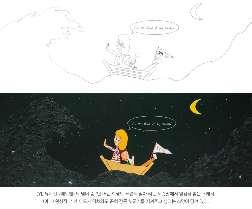 저는 작품을 그릴 때 ‘가장 사랑하는 사람에게 선물로 줄 수 있는 그림을 그리자’고 생각할 때가 많아요. 그런 사람에겐 보통 꽃을 선물하는 경우가 많지만, 저는 별이나 달을 선물하고 싶기도 했어요. 그래서인지 제 그림에는 달, 별이 자주 등장합니다. 별은 희망, 달은 꿈이나 이상향의 이미지죠. 마음을 다해 사랑하는 존재가 생기면 ‘모든 것을 다 주고 싶다’는 마음이 들잖아요. 그 마음이 작품에 표현되었으면 했어요. 제 작품을 만난 사람들이 잠시라도 잊었던 꿈이나 희망을 환기할 수 있으면 해요.