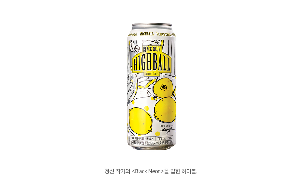 레몬하이볼 완성본을 받았을 때, 하이볼캔 전체를 감싼 작품의 이미지가 선명하고 산뜻하다는 느낌을 받았어요. 아주 뿌듯하고 약간 소름도 돋았던 것 같아요. (웃음) 그리고 차분하게 유리잔에 얼음을 담고 하이볼을 쪼르르 담아 마셨는데, 맛이 부드럽고 향이 깊으면서도 상큼했어요. 그때 그 느낌이 아직도 잊히지 않아요.