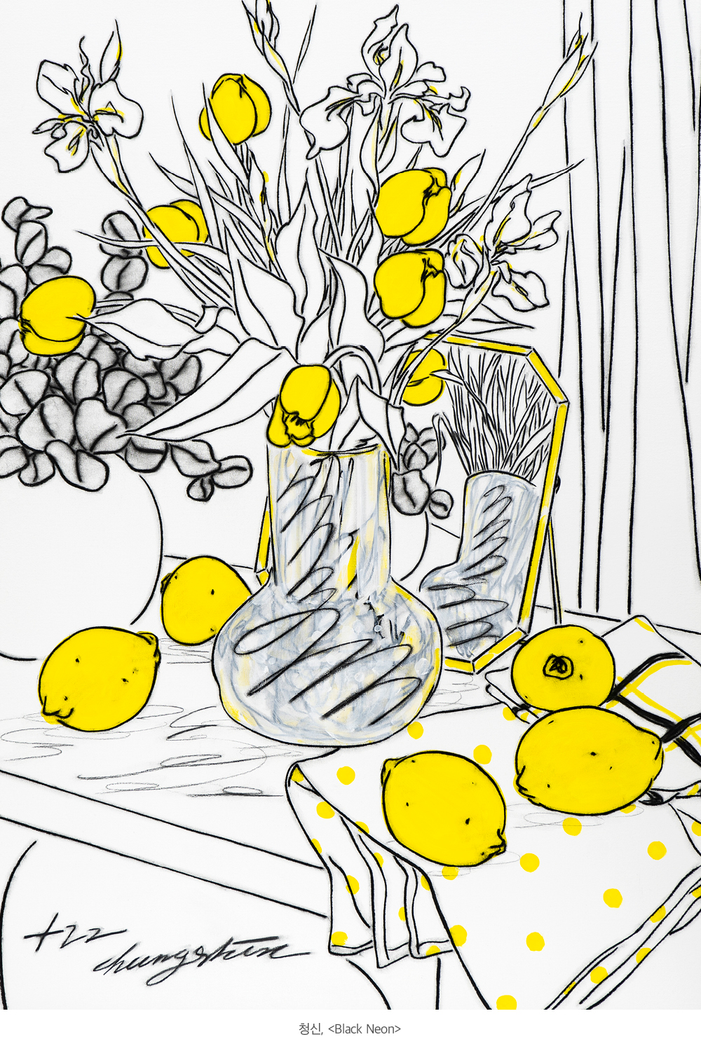 작가님의 작품에는 목탄과 노랑이 자주 쓰이고, 소재로는 꽃과 레몬이 자주 등장하네요. 어떤 의미가 있을까요?