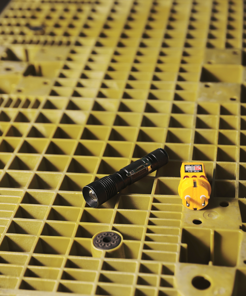 물류센터 내부가 밝긴 하지만 기기 아래 청소가 잘 되어 있는지, 먼지가 쌓여 있지는 않은지 위생을 꼼꼼히 체크해야 하기 때문에 손전등을 꼭 지참합니다. 또한 자동화 물류센터에서는 기기 고장이 심각한 업무 과부화를 불러올 수 있어 접지에 문제가 없는지 잘 확인해야 하는데요. 이때 검상기는 필수죠.