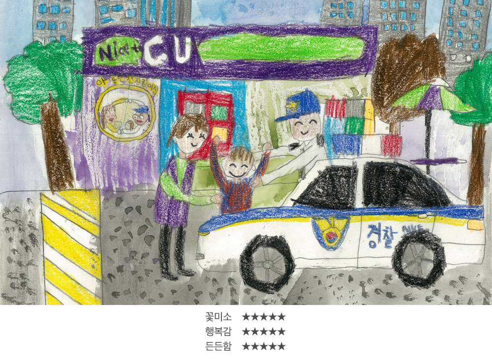크레파스 필치가 물씬 묻어나는 그림 속 웃음꽃이 활짝 피었습니다. 경찰도, CU 스태프도, 어린이도 백만 불짜리 미소를 보여주고 있네요. 모두가 행복한 이 그림만으로 벌써 마음이 든든해지는걸요?