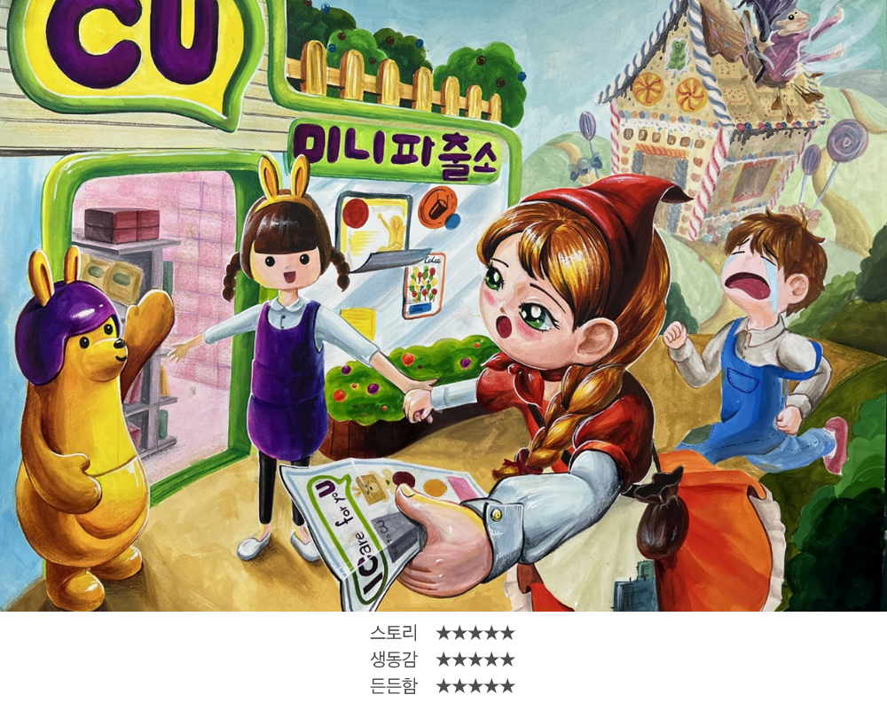 마녀의 과자집에서 달콤한 유혹에 빠졌던 아이, 정신을 차려 보니 길을 잃은 것 같습니다. 빨간 두건을 쓴 소녀가 CU스태프와 손을 잡고 아이의 집을 찾아 주고 있네요. 소녀가 들고 있는 종이에는 아이CU의 슬로건인 ‘ICare for yoU’가 적혀 있고요. 스토리는 물론 입체감이 물씬 느껴지는 그림에 감탄하지 않을 수 없어요.