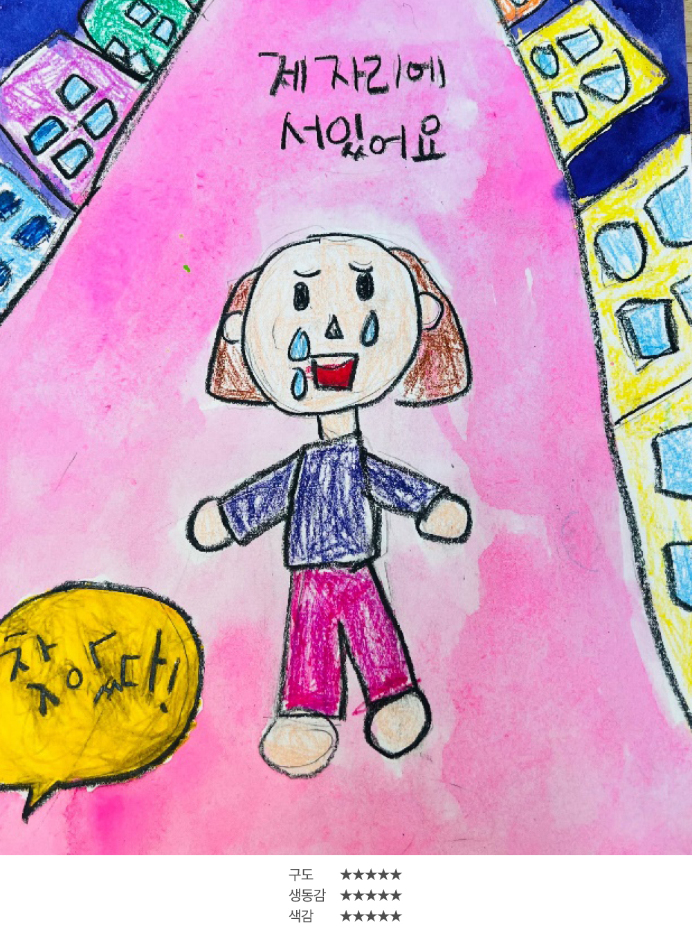 맞아요. 엄마아빠 손을 놓쳤을 땐 그대로 얼음! 제자리에 서 있어야 해요. 알록달록 예쁜 색채가 돋보이는 그림 속에 한 아이가 울고 있습니다. 찾았다! 한 마디에 가슴을 쓸어내리게 되네요. 넓은 도로와 늘어선 건물, 정면에 서 있는 아이까지 원근감이 제법 멋져요.