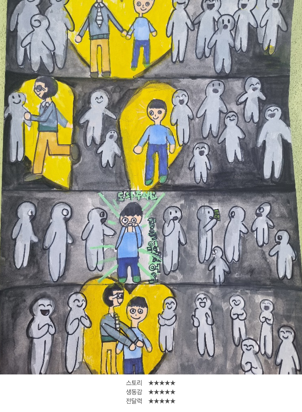 지나다니는 사람 사이 노란 하트 스포트라이트가 아빠와 나를 비춰주고 있습니다. 잠시 아빠의 손을 놓치고 나서 힘껏 외쳤지요. “도와주세요, 길을 잃었어요!” 이내 아빠가 달려와 나를 다시 꼬옥 안아줍니다. 훌륭한 네 컷 스토리에 주인공만 컬러로 채색한 센스가 돋보이는 그림이에요.