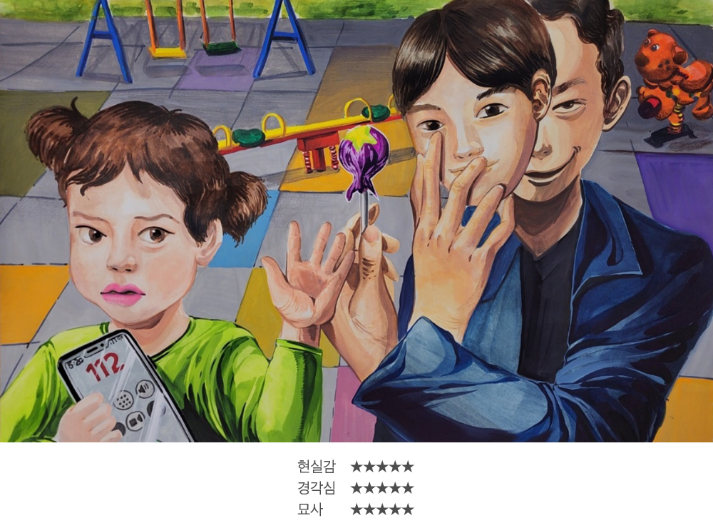 선한 얼굴의 한 남자가 놀이터의 아이에게 달콤한 사탕을 내밉니다. 앗, 가면을 슬쩍 벗으니 의미심장한 어둠의 미소가 감춰져 있었네요. 다행히 아이는 경계를 늦추지 않고 얼른 112를 호출합니다. 긴박한 순간, 현명한 아이의 대처에서 많은 것을 배우게 됩니다.