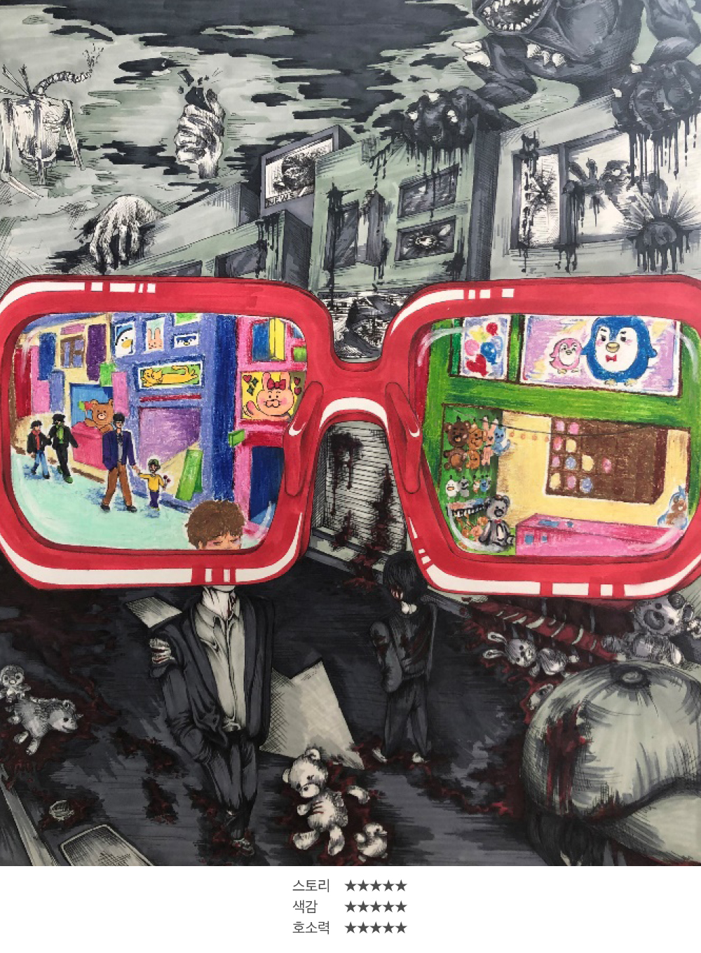 학대받는 아이에게 세상은 잔인하고 어둡고 무서운 곳입니다. 그럼에도 불구하고 안경 속 아이의 시선에서 사람들은 모두 밝은 풍경 속에 있죠. 아이가 바라는 건 그저 평범한 일상 아닐까요? 어쩌면 학대의 흔적은 쉽게 찾아볼 수 없을지도 모릅니다. 관심을 갖고 자세히 들여다보면서, 모든 아이들의 소중한 일상이 빛날 수 있도록 지켜줍시다.