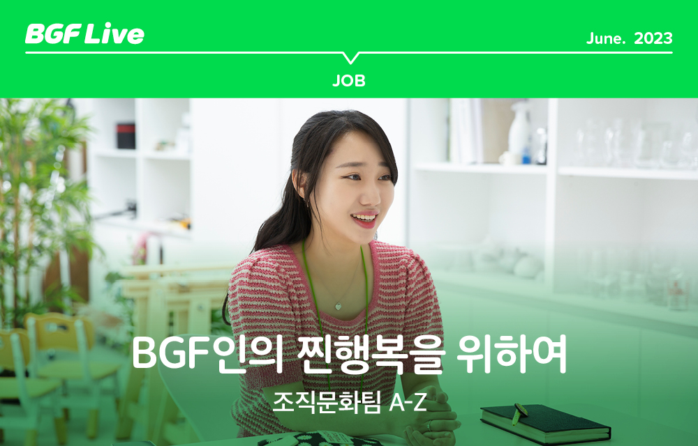 조직문화팀은 BGF 임직원들이 회사 업무를 좀 더 행복하고 즐겁게 할 수 있는 사내 문화를 만들기 위해 노력하는 팀입니다. BGF만의 조직문화를 전파하고 임직원이 어떤 경험을 하는지 면밀하게 관찰하죠. 또 임직원의 업무 몰입도가 높아질 수 있도록 복리후생을 돌보고, 한편으로는 노무관리도 담당합니다. 이렇게 다양한 업무 가운데 저는 복리후생을 주로 맡아 하고요. 사실상 임직원들은 복리후생을 통해 가장 쉽고 빠르게 회사 문화를 가늠해요. 그래서 어떻게 하면 우리 임직원들이 더 즐거운 체험을 하실 수 있을까 기획하고 있어요.