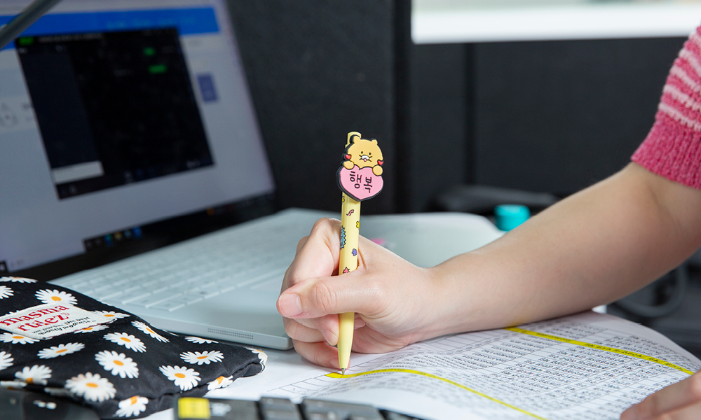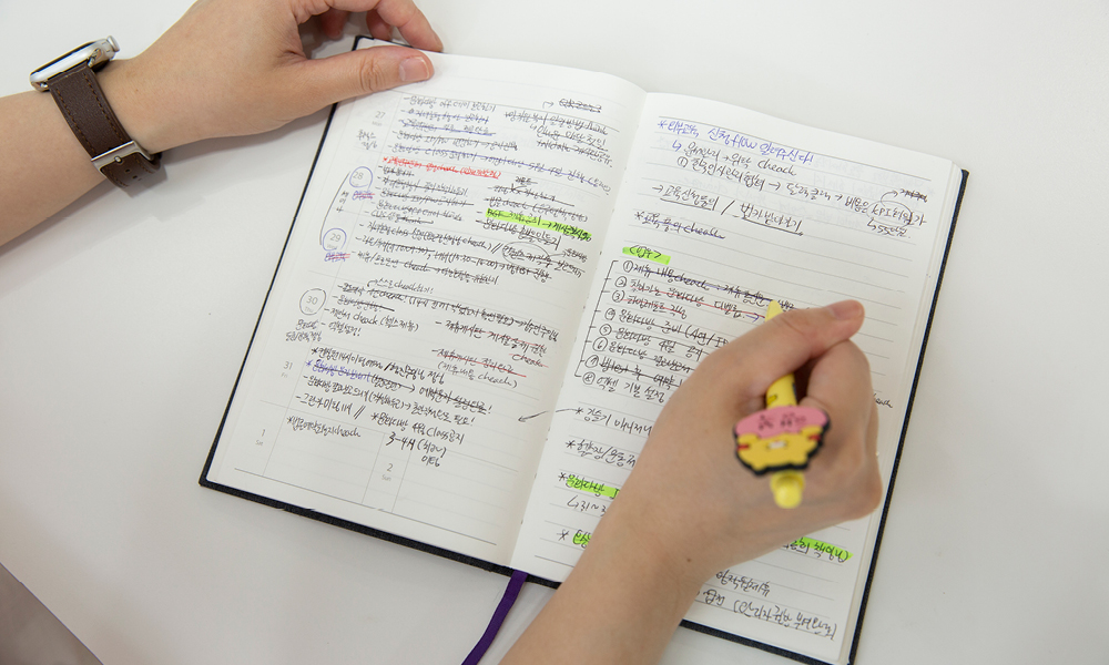 일정표와 ‘TO DO LIST’가 빽빽하게 정리되어 있는 업무 다이어리. 자신을 ‘찐 J’라고 소개하는 조가영 주임의 필수 아이템입니다. 그 옆에 있는 것은 행복을 전한다고 믿는 ‘행복 볼펜’. 사용할 때마다 기분이 좋아져 더욱이 애장하는 펜입니다.