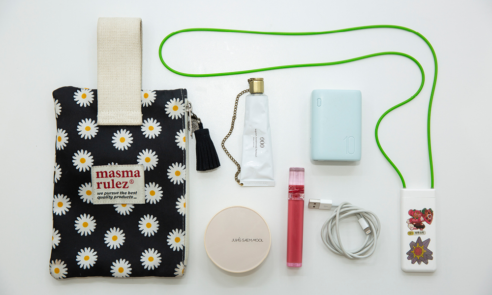 조가영 주임은 평일에 가방이 아닌, 작은 파우치를 들고 출근합니다. 외부 미팅 시에도 좋은 이미지를 남길 수 있는 핸드크림, 임직원들의 문의를 언제 어디서든 받을 수 있도록 충분히 충전한 보조배터리, SC 직무를 수행할 때 점주님들이 선물해주신 스티커가 붙어 있는, 사랑 가득한 사원증이 들어 있죠. 무엇보다 이 파우치는 신입사원일 적 멘토였던 선배님과의 ‘커플템’으로 조가영 주임에게 큰 의미가 있는 물건입니다. 이 작은 파우치에 들어 있는 최소한의 필수품을 보면서 매일의 업무를 열심히 해냅니다.