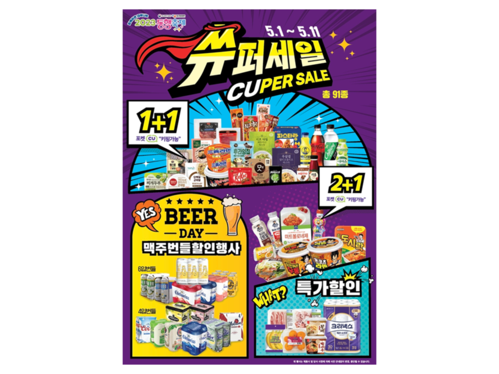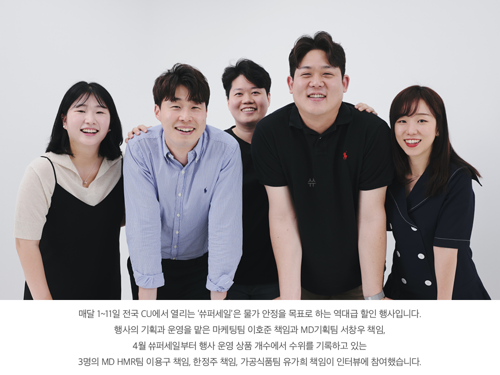이호준 책임 장바구니 물가가 뛰어오르면서 고객의 가격 민감도도 점점 커지고 있어요. 1+1 상품의 매출 비중이 2020년 17.2%에서 지난해 27.2%로 2년만에 10% 넘게 뛰었을 정도니까요. 지금이야말로 생활 밀착 플랫폼으로서 CU가 고객의 알뜰 장보기를 지원하고 나설 때죠. 쓔퍼세일이라는 역대급 할인 행사는 그렇게 탄생했습니다. 매달 90여 종에 이르는 행사 상품 가운데 1+1 혜택이 절반이 넘고, 2+1이나 한정 특가 상품도 즐비하죠. 지금껏 CU의 할인 행사 가운데 최다 물량, 최고 혜택이라 자부합니다. ‘쓔퍼세일’이란 네이밍도 이런 역대급 할인 혜택에 CU의 정체성을 결합해 지었어요. 이름만 듣고도 고객이 ‘아, 지금 CU에서 장 보면 뭔가 엄청난 할인을 받을 수 있겠네’라고 단번에 알아차릴 수 있게요.