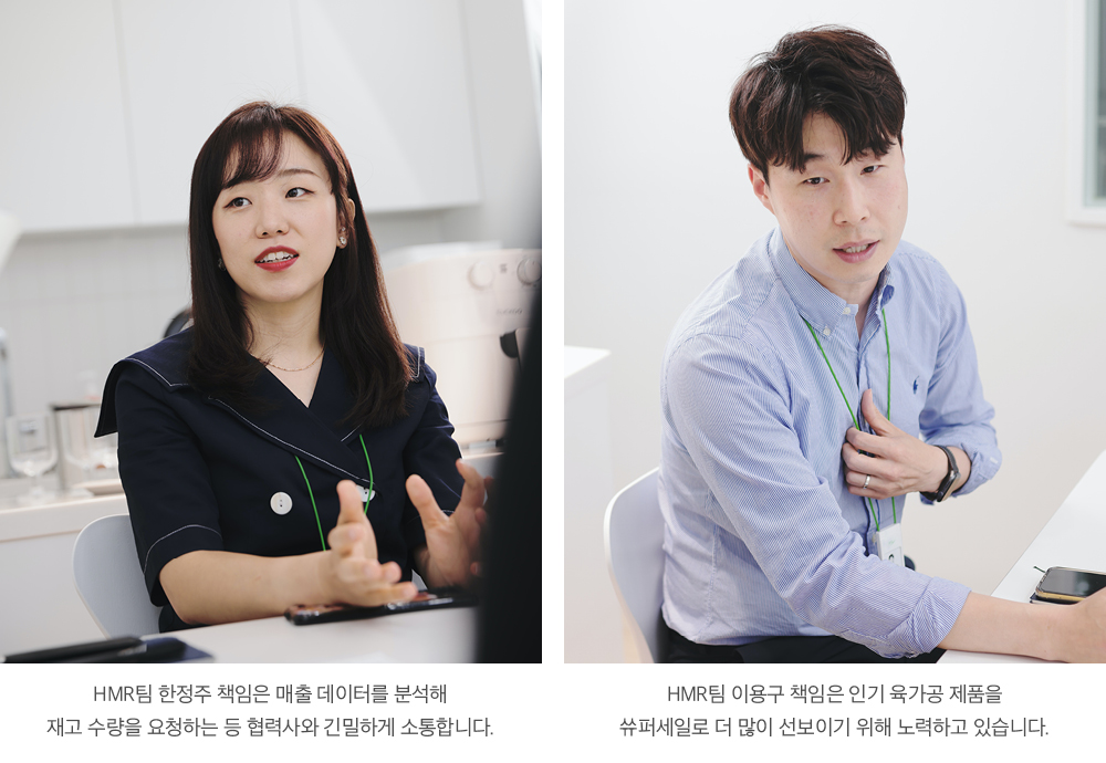 이용구 책임 저도 HMR팀에서 한정주 책임과 함께 MD로 일하고 있어요. 육가공 상품이 주종목인데요. 핫바, 가공란, 냉장 안주 상품의 행사 진행과 신제품 개발을 맡고 있어요.