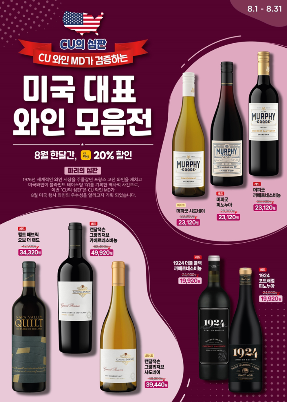 올해 여름 CU에서는 와인의 역사를 다시 쓴 ‘파리의 심판’을 되새기며, 이번엔 편의점 와인의 역사를 바꿀 기획전 ‘CU의 심판’을 준비했습니다. 미국 와인 중에서도 8종을 엄선해 내놓은 것인데요. 8월 한 달 동안 해당 와인을 KB페이로 결제할 경우 20% 할인 혜택도 받을 수 있습니다. 이 8종의 미국 와인은 하루에도 수십 병의 주류를 접하는 BGF리테일 주류TFT 구성원들이 직접 나서서 엄정하게 선정했죠. 그렇다면 어떤 와인이 그 영예를 안았을까요?
