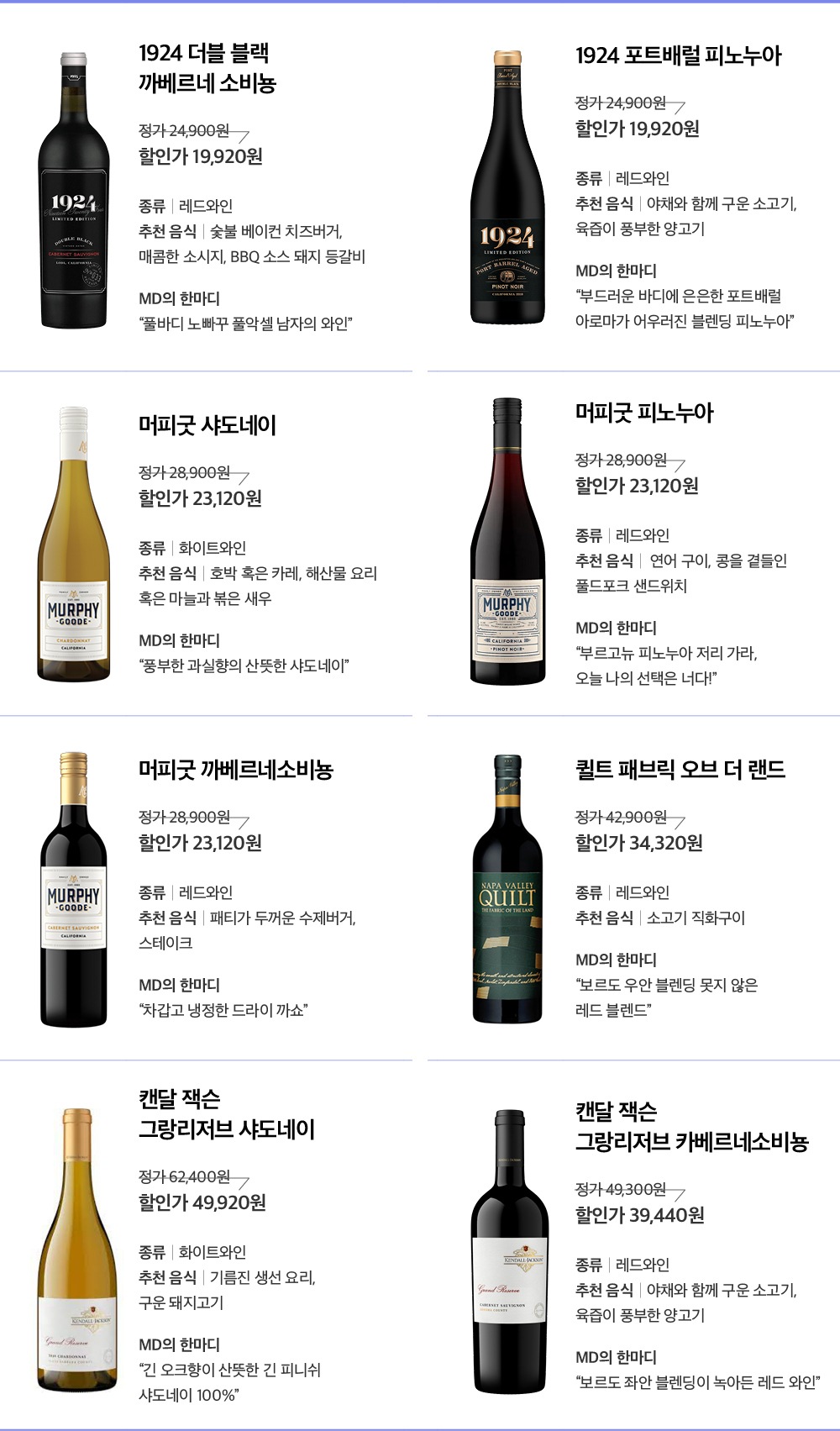 이번 기획전을 준비하며 가장 공들였던 와인은 ‘캔달잭슨 그랑리저브’입니다. 최근 2~3년간 거의 행사를 진행하지 않은 상품이기도 했고요. 행사를 했더라도 이번 기획전 같은 혜택은 없었습니다. 캔달잭슨 그랑리저브는 미국 와인의 특징인 오크향이 질적으로 다른 와인인데요. 마시면서 온도가 올라가도 오크향과 알콜향이 거칠게 느껴지지 않습니다.