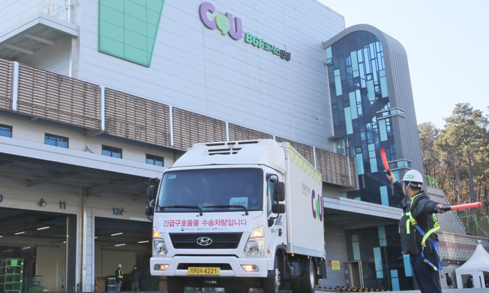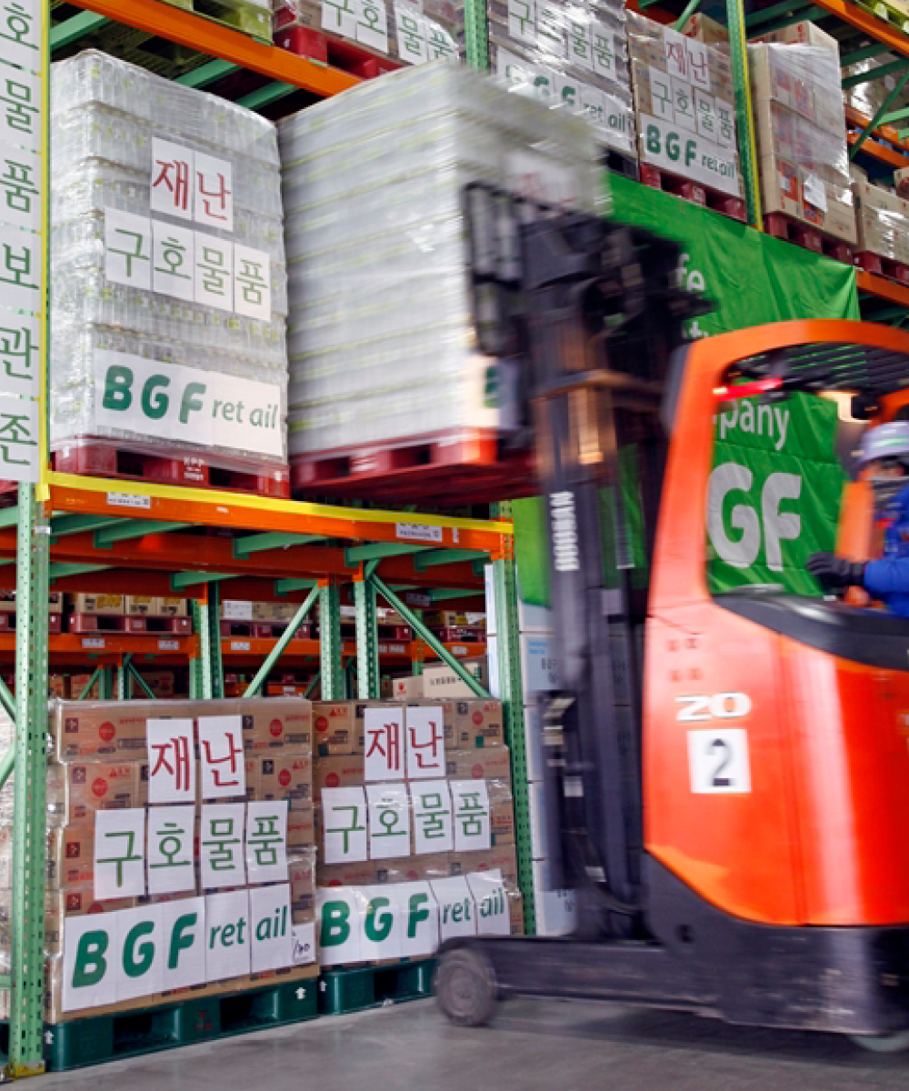 이재민에게 가장 필요한 물자는 바로 식음료입니다. 전국재해구호협회 희망브리지는 파주와 함양에 물류센터를 보유하고 있지만, 전국에 구호물자를 파견하기에는 한계가 있었죠. 바로 이때 BGF리테일이 보유한 전국 30여 개 물류센터와 CU의 1만 7천여 점포 네트워크가 큰 도움이 되어주었습니다. 재해 현장에 즉각 구호물품을 전달할 수 있었으니까요. 일례로 지난 고성에 산불이 발생했을 때, 고성까지 운반 시간만 4~5시간 이상 소요되는 희망브리지 물류센터 대신 BGF리테일이 신속하게 구호물품을 지원했답니다.