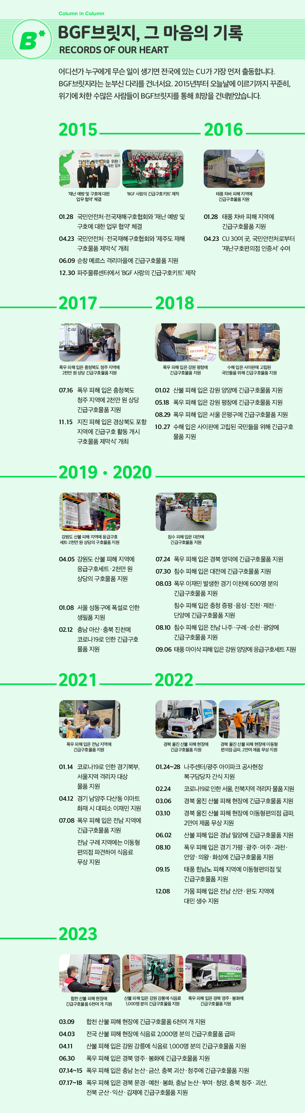 지난 2015년, BGF리테일은 업계 최초로 행정안전부, 전국재해구호협회 희망브리지와 ‘재난 예방 및 구호에 대한 업무협약’을 맺었습니다. 나아가 구호 요청이 오자마자 바로 출동할 수 있도록 긴급구호활동 네트워크 ‘BGF브릿지’도 구축했고요. 덕분에 2015년부터 신속한 활동을 펼쳐왔는데요. 지난 2019년에는 고성·양양 산불, 2020년에는 대전·이천·영덕 수해, 2021년 구례·곡성·보성·나주 수해, 2022년 울진·밀양 산불 때도 업계에서 가장 먼저 긴급 구호활동을 펼친 바 있습니다.