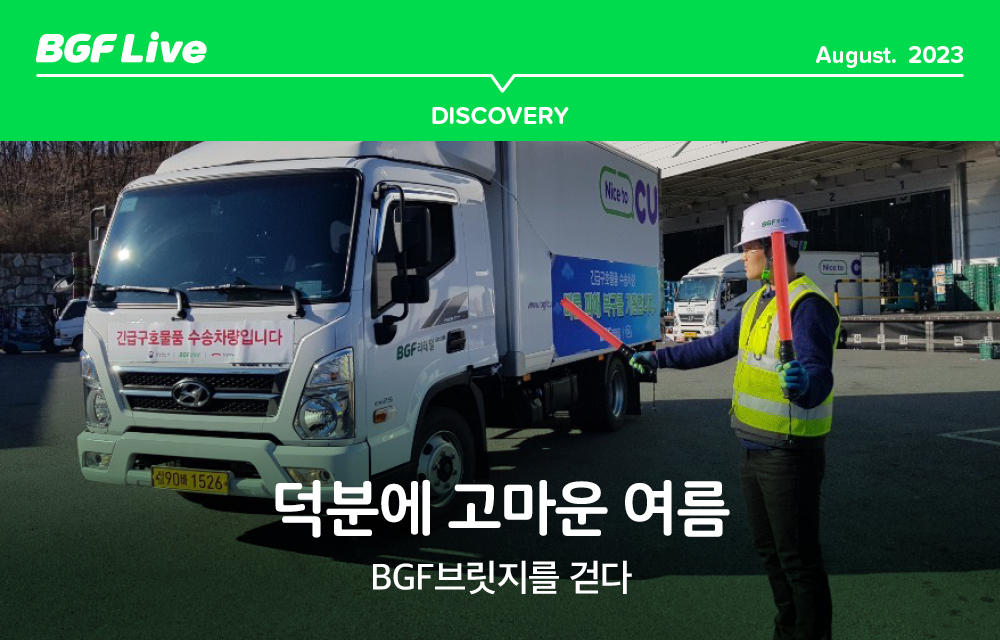 이곳은 기록적인 폭우가 쏟아진 충남 논산, 현수막을 붙인 차량 앞에 길게 줄이 늘어섰습니다. 아직도 그치지 않은 빗방울 가운데 우비를 입은 사람들이 분주하게 구호물품을 배분합니다. 이윽고 이재민이 한아름 받아드는 생수, 라면, 이온음료, 초코바 등 식음료. 이 차량은 BGF리테일에서 급파한 긴급 구호물품 수송차량입니다. 예상치 못한 재난에 우왕좌왕하는 현장 속에서도 이재민에게 꼭 필요한 구호물품을 공급하고 있죠.