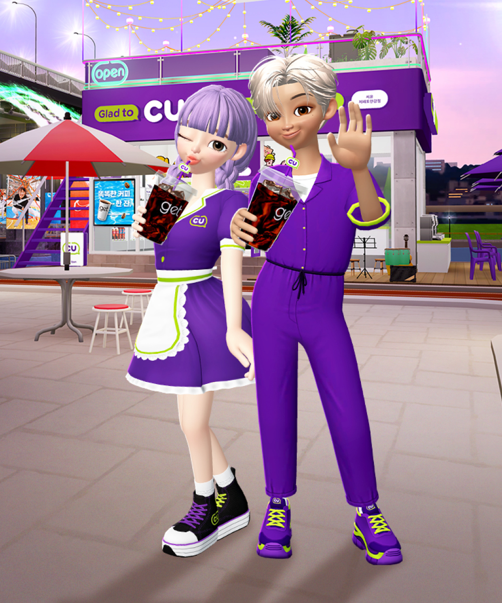 제페토의 주 이용자는 Z세대, 그 중에서도 10대가 대다수예요. 생기발랄한 Z세대를 맞이하기 위해 최근 인기가 많은 브랜드들을 확보하고, get 카페를 낭만적인 루프탑으로 새롭게 꾸몄습니다. 오프라인 CU 점포와 가장 다른 점이기도 하지요. 여름철 루프탑에서 여유롭게 커피를 즐기며 SNS를 하는 Z세대의 모습을 연상하며 구성한 것인데요. 제페토 월드맵 유저들은 혼자 활동하기보다는 다른 사람을 만나 대화를 나누는 일이 많잖아요. 유저들이 함께 만나 루프탑 카페를 이용하면 참 좋을 거예요.