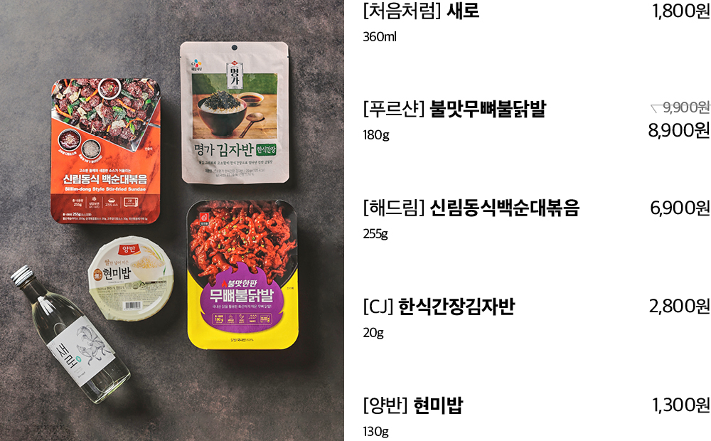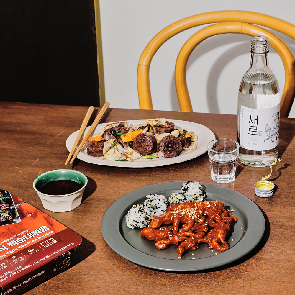 냉장고에 차게 식혀둔 쐬주를 까서 따르면 공기를 머금어 꼴꼴꼴 소리가 나지요. 그야말로 힐링 ASMR이랄까요. 가당을 사용하지 않은 제로슈거 소주 ‘새로’는 알코올 냄새 없이 산뜻하고 부드러워 혼자서도 술술 넘어가죠. 전자렌지에 ‘불맛무뼈불닭발’과 ‘신림동식백순대’ 몇 분 돌리는 동안 밥 조물조물 뭉쳐서 짭짤한 김자반에 도로록 굴려 주먹밥 몇 개 만들면 한 끼 식사가 뚝딱 차려지고요. 전자렌지 땡 하면 김 솔솔 오르는 닭발과 백순대를 꺼냅니다. 매콤하니 불맛 진한 무뼈닭발과 고소한 들깨가루 버무린 백순대 번갈아 먹다 보면 기분 개운한 것이 이게 인생의 맛 아닌가 싶어요.