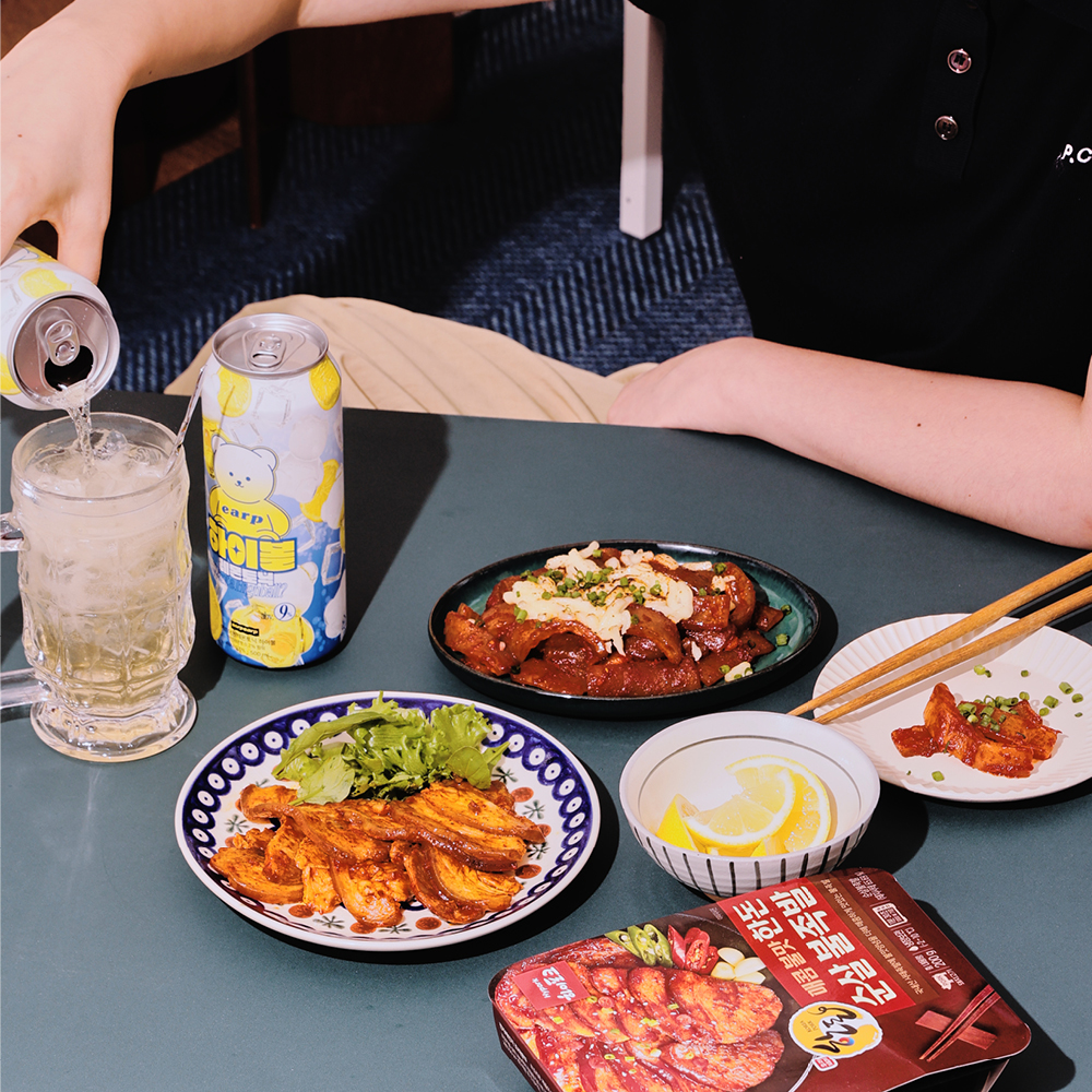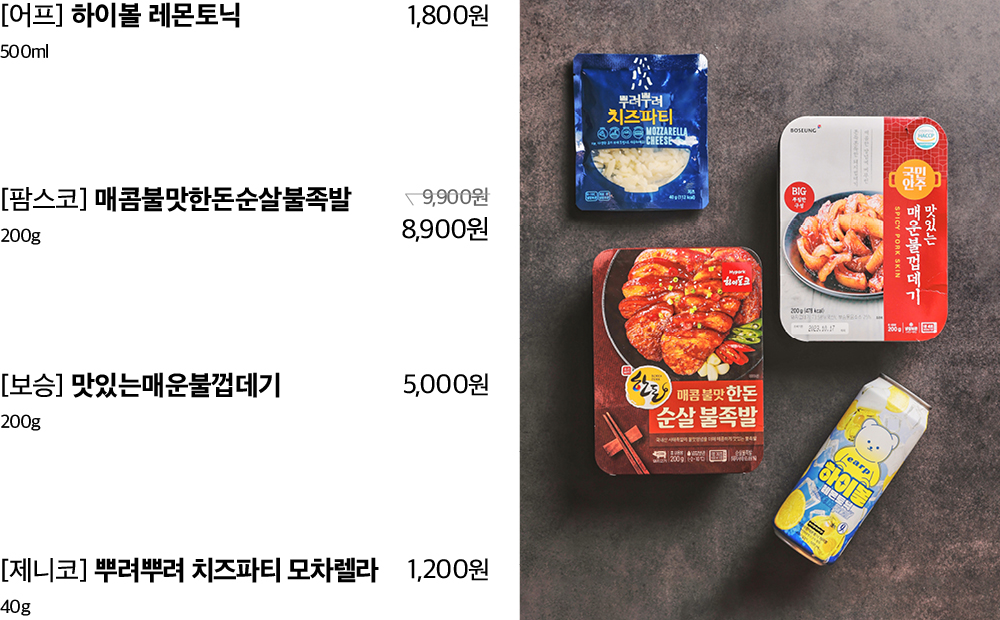 깔끔한 소주도 좋지만 달큰 쌉싸름한 향이 맴도는 시원한 하이볼이 땡길 때도 있잖아요. 큼지막한 하이볼 잔에 얼음 와라락 담고 ‘어프 하이볼’ 콸콸 따르면 위스키와 토닉 없이도 원터치 하이볼이 완성되지요. 비밀인데, 하이볼과 매콤한 안주가 그렇게 잘 어울리거든요. 산뜻하고 세련된 하이볼 한 모금에 ‘매콤불맛한돈순살불족발’과 ‘매운불껍데기’ 뜨끈하게 데워서 한 젓가락씩 먹으면 아주 좋아요. 좀 심심하다 싶으면 ‘뿌려뿌려 치즈파티’ 뜯어서 토핑하고 데워보세요. 주욱 늘어나는 짭짤한 치즈가 매운맛을 중화시키면서 혀끝에 착 감깁니다. 하이볼 두 캔이 눈앞에서 사라지는 마술을 경험할 수 있지요.