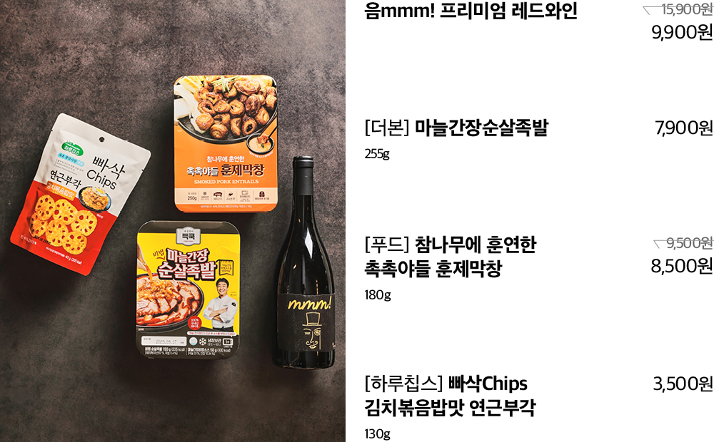 아껴둔 와인만큼 나에 대한 확실한 보상이 없지요. 코르크를 따는 순간부터 설레니깐요. CU에서만 판매하는 ‘음mmm! 프리미엄 피치니 와인’을 둥그런 와인잔에 솰솰 따르면 이미 진한 과실향이 코끝을 자극하고요. 한 모금 머금어 혀로 굴려보면 오크향이 감돌며 바닐라 뉘앙스가 부드럽게 느껴집니다. 이때는 또 부드러운 족발에 쫄깃한 훈제막창이 제격인데요. ‘마늘간장순살족발’에는 더본만의 비법인 달콤쌉싸름한 소스가 듬뿍 배어있고요. ‘촉촉야들 훈제막창’은 잡내 없이 야들야들 고기육즙이 사르르.. 너무 부드럽다 싶으면 매콤한 연근칩 한입 빠삭 씹어주고요. 약간 귀찮긴 하지만 연근부각을 손으로 파삭파삭 부숴 족발 위에 뿌리면 또 별미입니다.