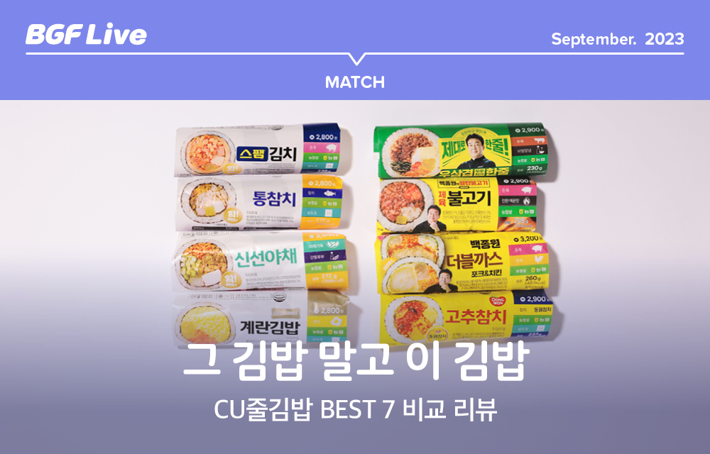 삼각김밥 하나는 왠지 허하고, 컵라면을 같이 먹자니 양이 많은 것 같고, 외식을 하자니 너무 비싸고. 그럴 땐 줄김밥을 집어보세요. 아니 그 김밥 말고 그 옆의 김밥, 아니다 그 옆에 있는 것도 괜찮은데. 일곱 종 모두 베스트셀러라는데, 그냥 다 먹어볼까요?