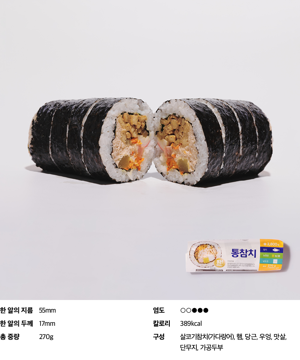 밥의 단맛과 참치의 고소한 맛이 어우러진 참치김밥입니다. 마요네즈를 첨가하지 않아 담백하지만, 가공두부와의 조화가 부드러워서 크리미한 느낌이 나네요. 달걀은 보이지 않으나 참치가 속재료의 1/2 정도를 차지할 만큼 듬뿍 들어있습니다. 양이 많은 편이므로 아침뿐 아니라 점심으로도 든든하겠어요. 참치 맛이 강하게 느껴지는 김밥이라서 재료별 조화로운 느낌은 덜하지만, 고소한 맛을 좋아하는 분들이라면 추천합니다.