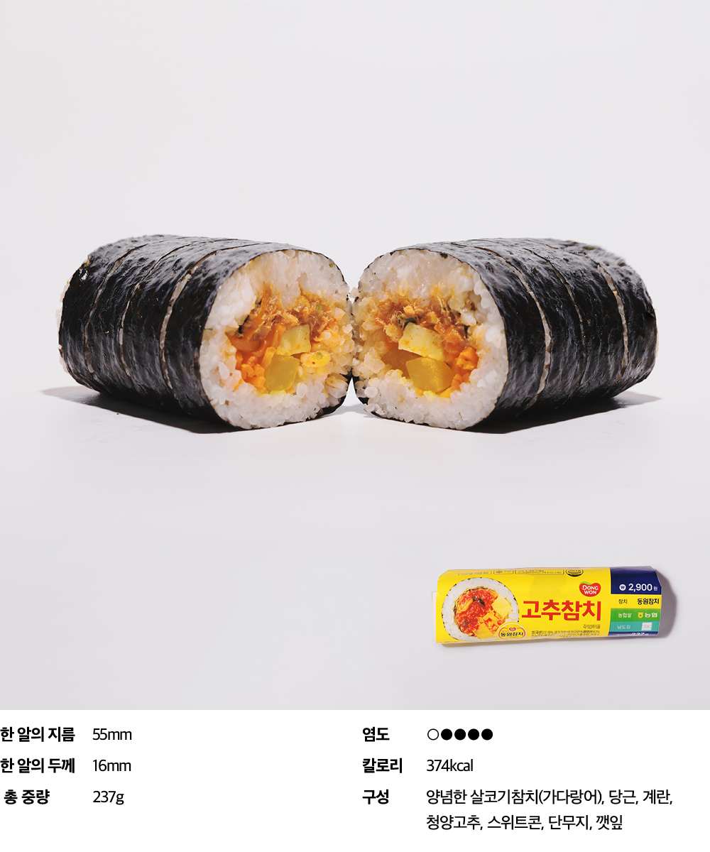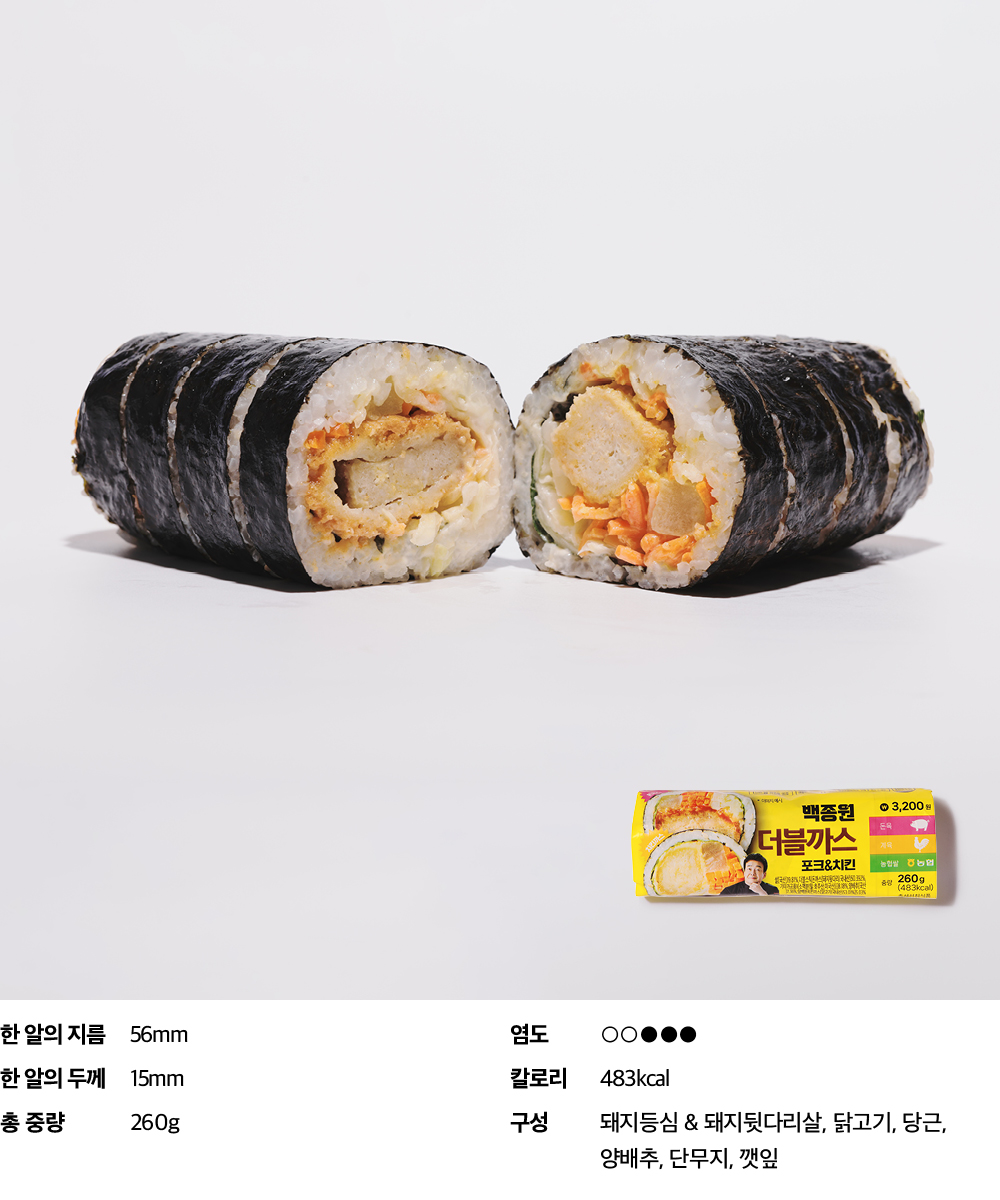 오늘 ‘가성비 갑’ 김밥을 꼽으라면 이 상품을 추천하겠습니다. 다른 제품보다 약 300~400원이 비싸지만 그 이상의 값어치를 하거든요. 딱 반을 가르면 한 쪽은 돈까스, 한 쪽은 치킨까스로 나뉘어 있습니다. 각각 어울리게끔 돈까스에는 깻잎과 돈까스소스를, 치킨까스에는 양배추와 마요네즈를 곁들인 센스도 돋보이죠. 고기 위주 상품이라 당근과 단무지 이외엔 야채가 없고, 그래서 좀 느끼할 수 있다는 점이 아쉽긴 합니다. 참, 꼭 데워 드세요!