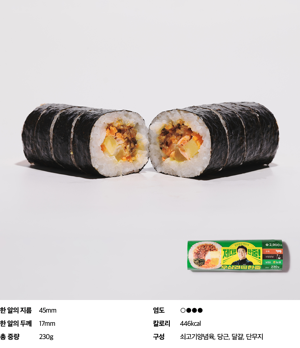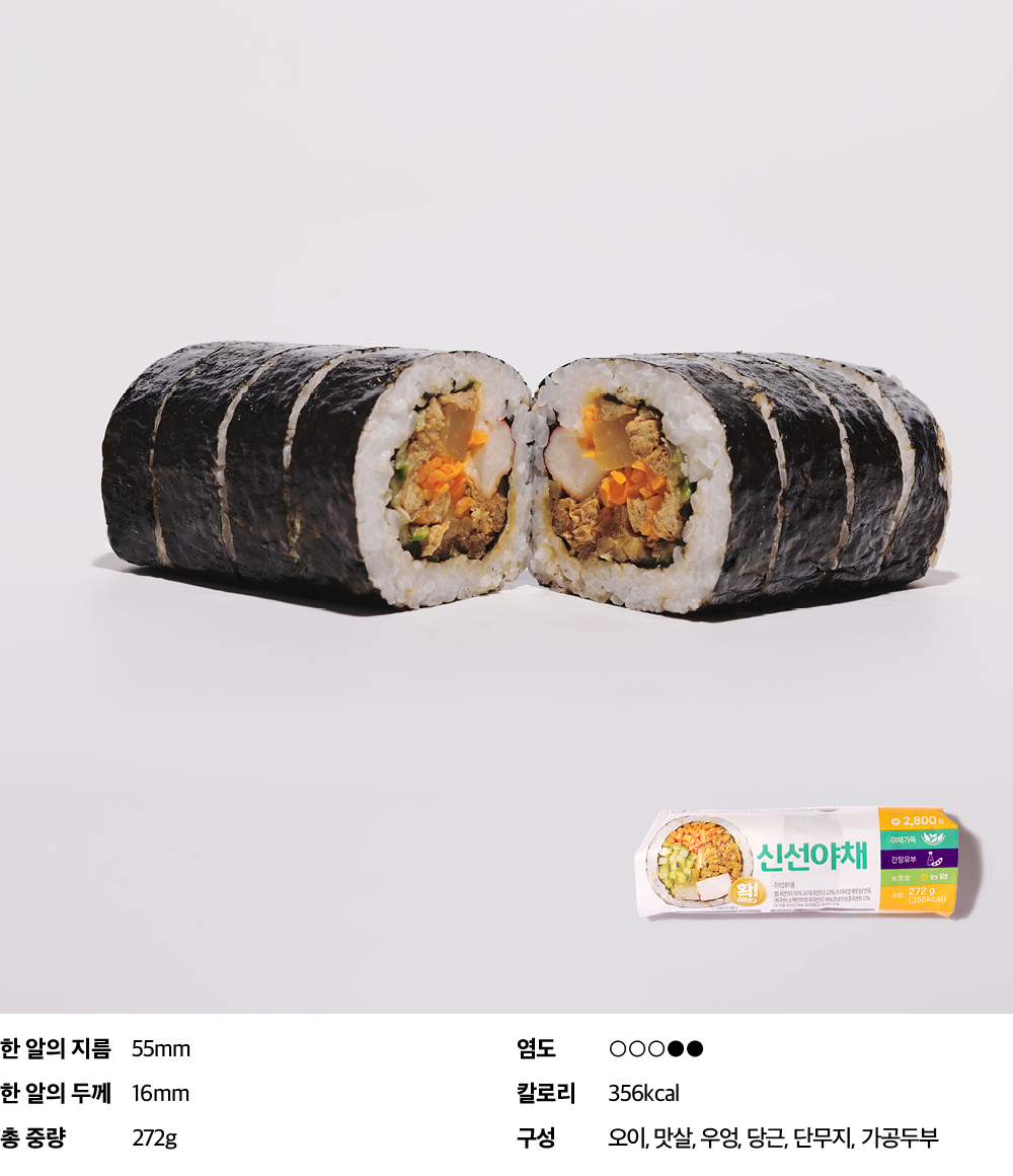 CU의 시그니처 줄김밥이자 야채가 듬뿍 들어간 상품이 등장했습니다. 채식주의자라면 환영, 육식주의자라면 미간에 힘이 들어갈 호불호의 대표주자죠. 역시 당근과 오이가 큰 비중을 차지해 이름의 위용을 보여주지만, 간장불고기양념소스가 얇게 발려 있어 의외로 야채 특유의 쌉쌀한 맛이 잘 나지 않습니다. 눈을 감고 먹으면 야채김밥인 줄도 모를 정도니 야채 싫어하는 아이도 홀딱 반하겠어요. 밥 양도 많은 편이라 남성이 한 끼 챙기기에도 든든합니다.