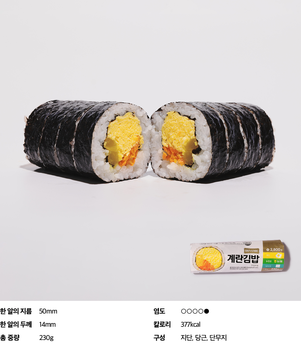 속재료의 2/3를 지단으로 채운 계란김밥, 씹을 재료가 크게 없어 오늘 맛본 모든 김밥 중에 입에서 가장 빨리 사라지는 것 같아요. 그만큼 식감도 부드럽고 몽글몽글 잘 넘어가니 더부룩한 날이라면 계란김밥이 좋은 선택지겠네요. 재료가 적어 맛이 그리 풍부하지는 않지만 야채김밥보다도 확실히 가볍고 담백합니다. 다이어트를 하시는 분들의 점심 메뉴로도, 바쁜 아침 간단한 한끼로도 추천할게요.