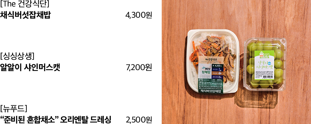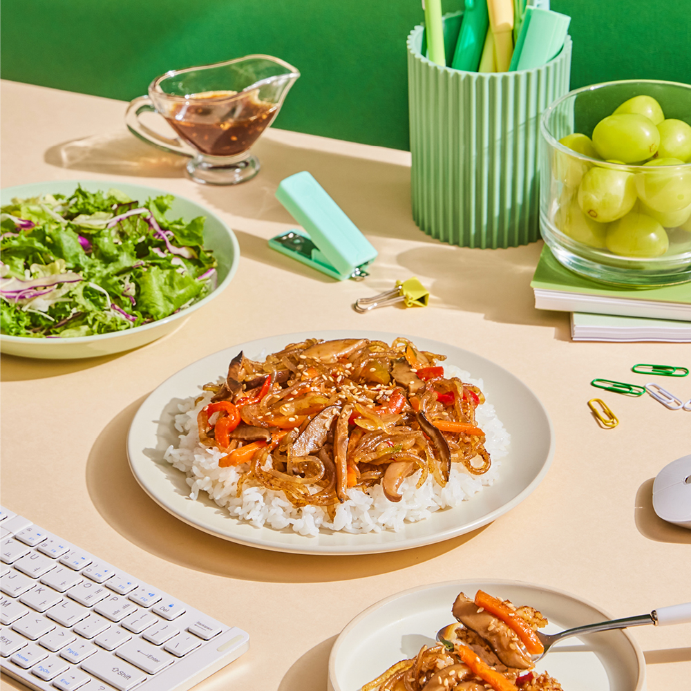 오늘은 업무량이 제법 많습니다. 점심은 그냥 건너뛸까 고민하다가 그래도 ‘밥심’을 믿어보기로 합니다. 단, 속이 더부룩하지 않은 식단으로요. 고기가 1도 들지 않은 채식버섯잡채밥을 전자레인지에 따끈하게 돌리고, 혼합채소 패키지를 북 뜯어 동봉된 드레싱을 뿌립니다. 오늘은 커피 대신 달콤한 샤인머스캣으로 디저트를 대신해요.