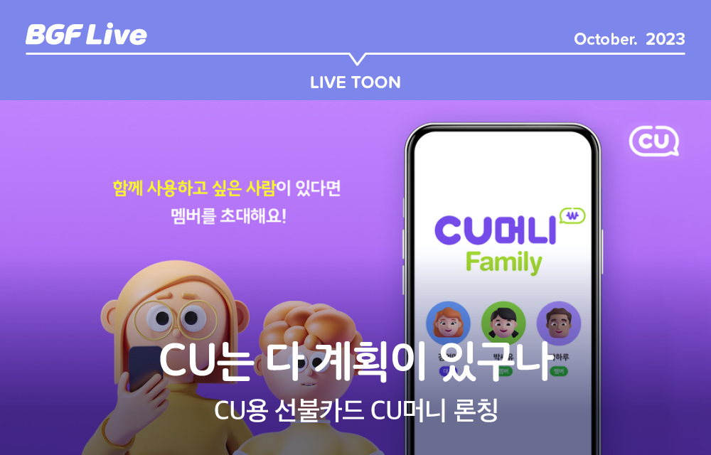 그렇다고 할 수 있어요. 다수의 멤버들끼리 CU머니를 공동으로 이용하는 ‘CU머니 패밀리’ 기능이 있거든요. 그룹 대표자가 패밀리 멤버를 초대, CU에서 사용할 머니를 전달·회수하는 기능이에요. 예를 들어 부모가 대표자가 되어 자녀를 CU머니 패밀리 멤버로 설정하는 거죠. 최대 5명까지 등록할 수 있고, 각각 개별 이용 한도도 정할 수 있어요. 위에서 설명한 구매 제한 기능도 CU머니 패밀리 기능 중 하나죠.