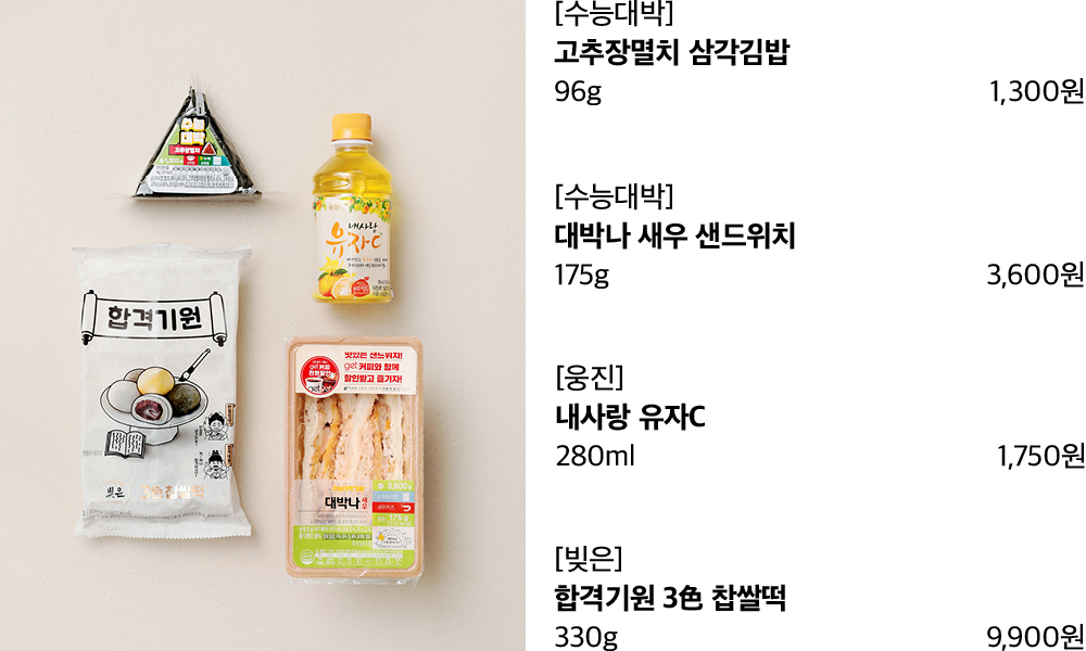 “공부하느라 힘들지?” 학창시절 공부하는 책상 옆으로 스윽 간식거리가 올라올 때면, 열중하다가도 한 번 고개를 털고 기지개를 켜곤 했습니다. 공부도 힘이 있어야 잘 되는 것 같아요. 기출문제 하나라도 더 봐야 할 지금이라지만 그래도 밥을 먹어야 집중이 되니까요. ‘수능대박’이 대문짝만하게 찍힌 삼각김밥을 금세 해치우고 새우 샌드위치까지 먹고 나니 빈속이 금방 두둑해집니다. 합격기원을 상징하는 찹쌀떡은 부적처럼 가방 앞주머니에 챙기고, 따끈하게 데운 꿀 물병은 독서실 가는 동안 마시겠어요.