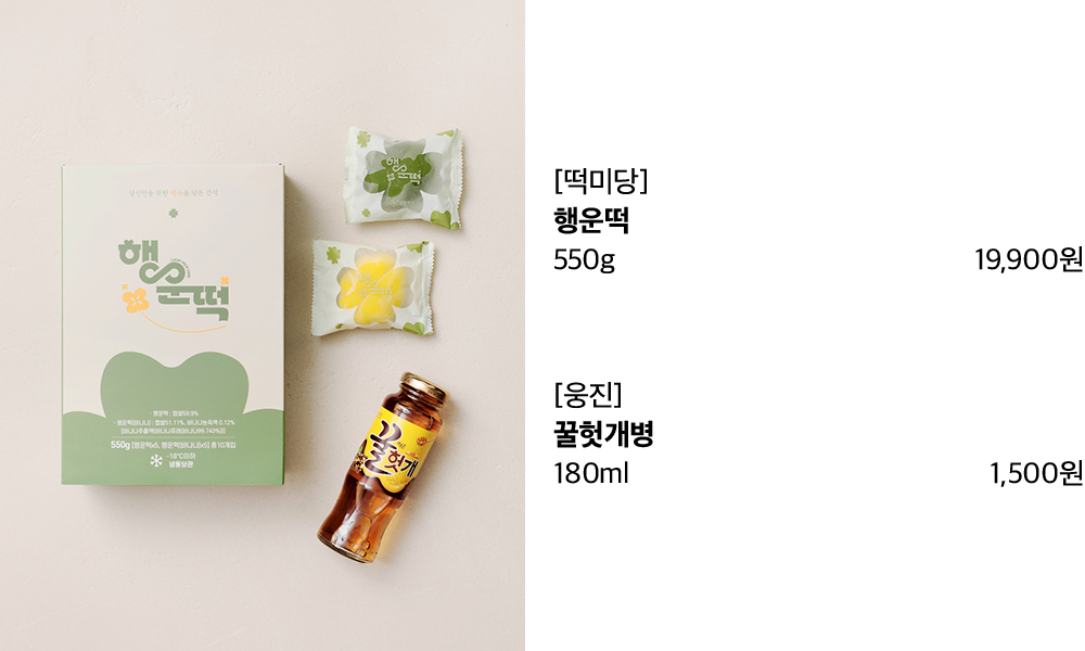 2대째 전통을 이어온 떡집 브랜드 <떡미당>의 정성과 기술력을 담은 행운떡 선물세트. 네잎클로버 문양을 찍어 의미를 더했다.