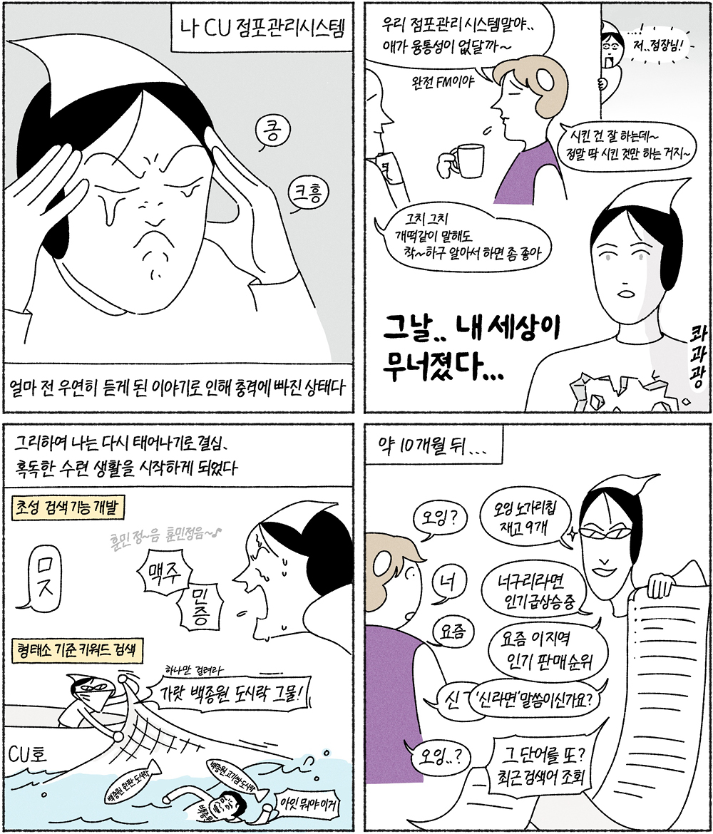 어휴, 힘들었어요. (웃음) 2019년부터 약 4년간 쌓인 점주님들의 이용 패턴과 다양한 피드백을 종합적으로 수렴해 만들었으니까요. 장장 10개월간 매일 늦게 퇴근하면서 프로그램을 끝없이 수정하고 또 테스트했던 기억이 나네요. 검증까지도 오랜 기간이 걸렸어요. 방대한 양의 데이터 정합성을 체크하는 것도 쉽지 않았고, 화면의 기능이 제대로 작동하는지 등 테스트할 케이스가 너무도 많았죠. 점포시스템팀 모두가 힘을 모아 지금의 결과물을 도출할 수 있었어요. 모두 감사드립니다.