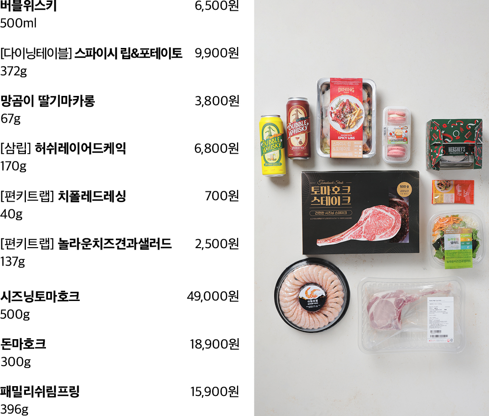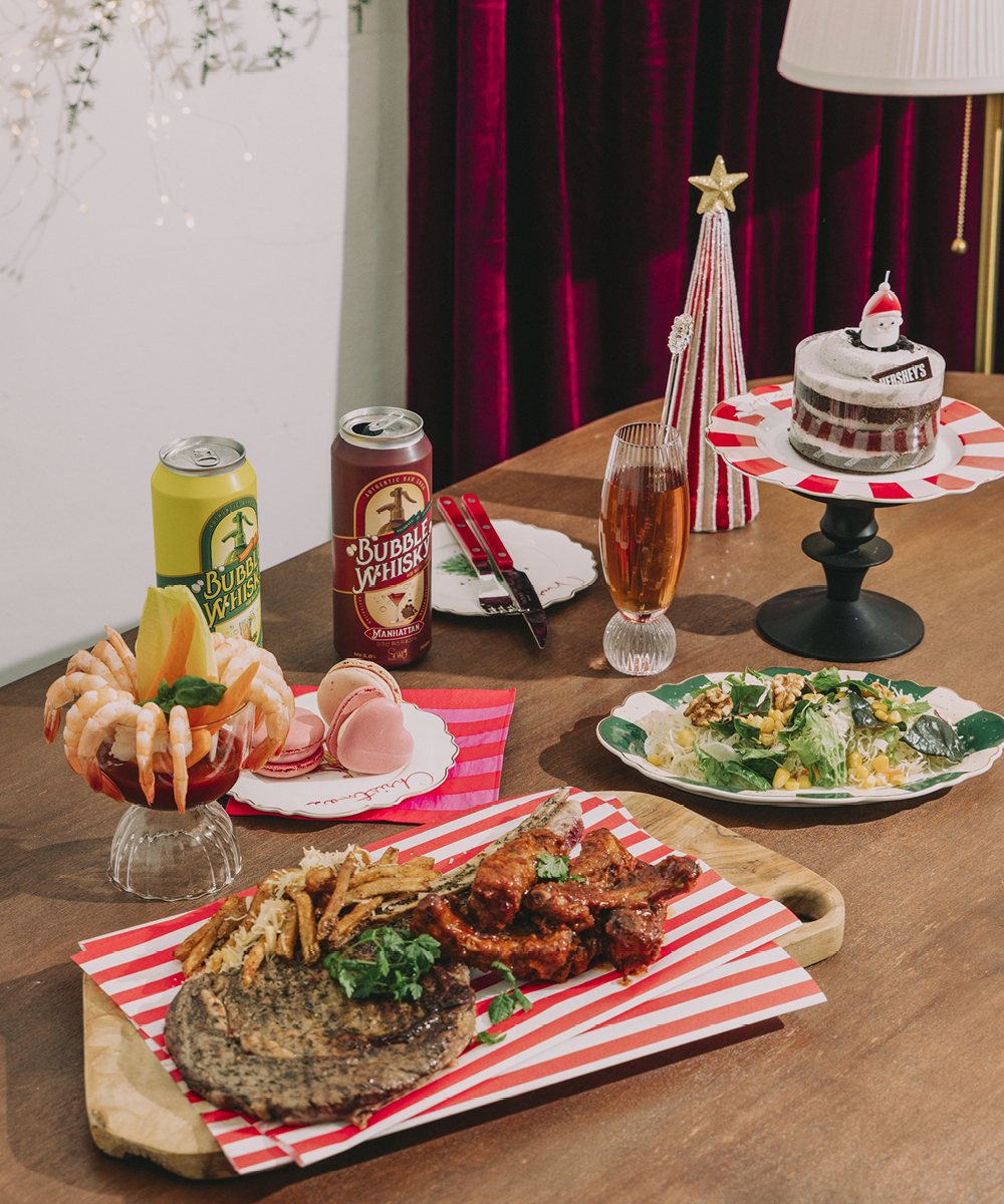 드레스코드는 레드와 그린. 분장도 가능! 오늘만을 위해 준비한 듯, 각자 개성 있게 꾸미고 얼굴을 마주하니 왠지 웃음부터 터지네요. 가장 먼저 미니케이크를 올리고, 미니 샐러드에는 고소한 드레싱을 휙 둘러주었어요. 통 크게 시즈닝 토마호크도 굽고, 컵에는 쉬림프링을 꽂아 나름 근사하게 분위기도 내봤죠. 이제 달달한 버블위스키 짠! 메뉴가 너무 많다고요? PT 선생님에겐 비밀이에요.