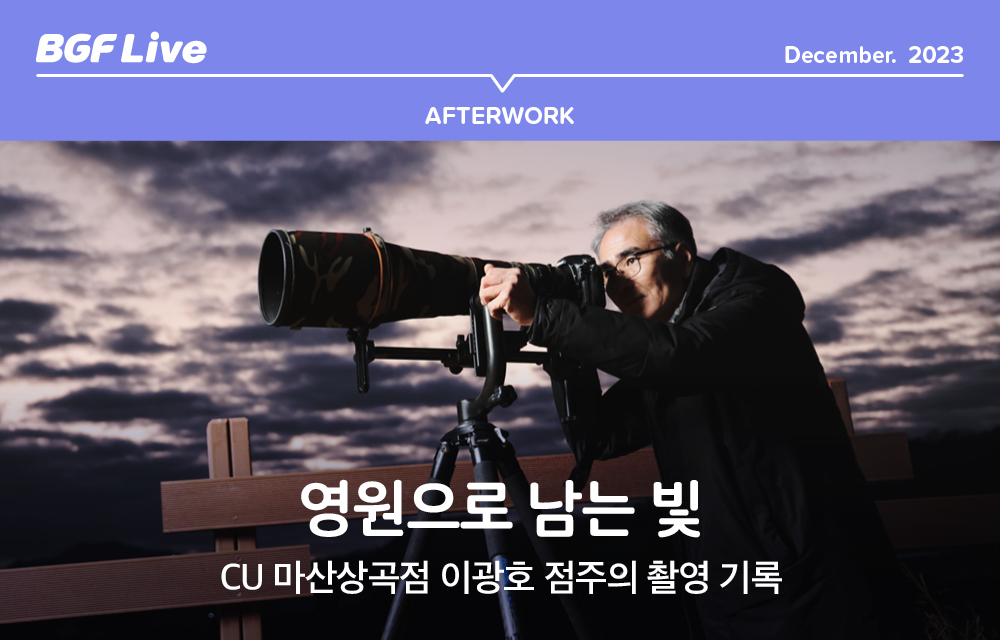 3년 전 CU를 연 이후에는 예전처럼 활발히 출사를 나가지 못하는 게 아쉽지만, 지금도 틈만 나면 주남저수지에 오고 싶다고 합니다. “아내 고향이 창원이에요. 딸애 공부도 시킬 겸 아내도 편하라고 이 지역으로 내려와서 편의점을 열었죠. 원래 하던 일을 나이가 들어 정리하면서 지금은 CU 점주와 사진작가가 저한테 가장 중요한 일이고요. 앞으로도 계속 이 두 가지를 병행하면서 잘 해나가고 싶어요. 그러려면 건강 관리를 잘 해야죠. 사진 찍으러 나갈 때마다 건강도 챙기려 신경 쓰고 있습니다.”