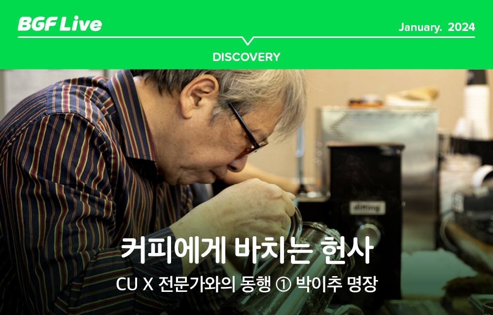 눈앞의 사람을 위해서도 아니고, 나 자신을 위해서도 아니고, 그저 커피를 위한 커피를 내린다는 박이추 명장. 안경 너머 뚫어져라 물줄기를 지켜보는 명장을 보노라면 ‘커피를 내린다’기보다는 ‘커피를 읽는다’는 말이 더 어울리는 것 같습니다. 40년 동안 하루도 빠짐없이 커피를 완독한 그의 눈빛에서는 장인의 자부심이 원두의 진한 색으로 우러납니다. 오랫동안 외길을 걸어온 박이추 명장과 BGF리테일 사이 닮은 구석이 무엇이냐 묻는다면 ‘진심’, 두 글자로 답하고 싶습니다.