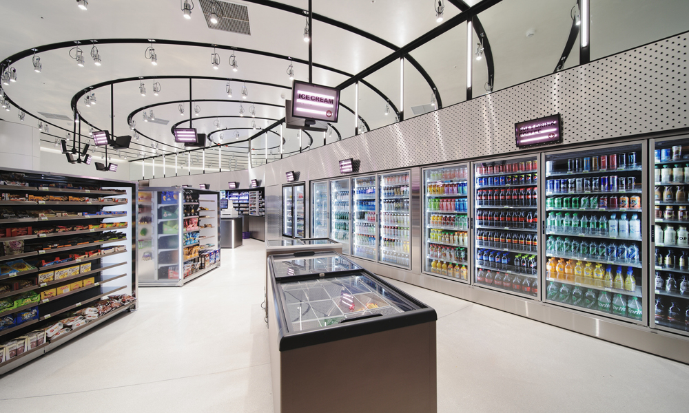 일반적으로 편의점 진열대는 성인 키보다 높이가 높고, 맨 윗부분도 개방형으로 뚫려 있습니다. 반대로 CU 인스파이어 리조트 2호점의 진열대는 일반 성인의 눈높이 정도로 낮고 윗부분도 막혀 있습니다. 덕분에 탁 트이고 정돈된 느낌 속에서 편안하게 쇼핑할 수 있습니다.