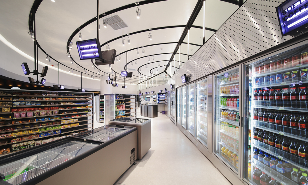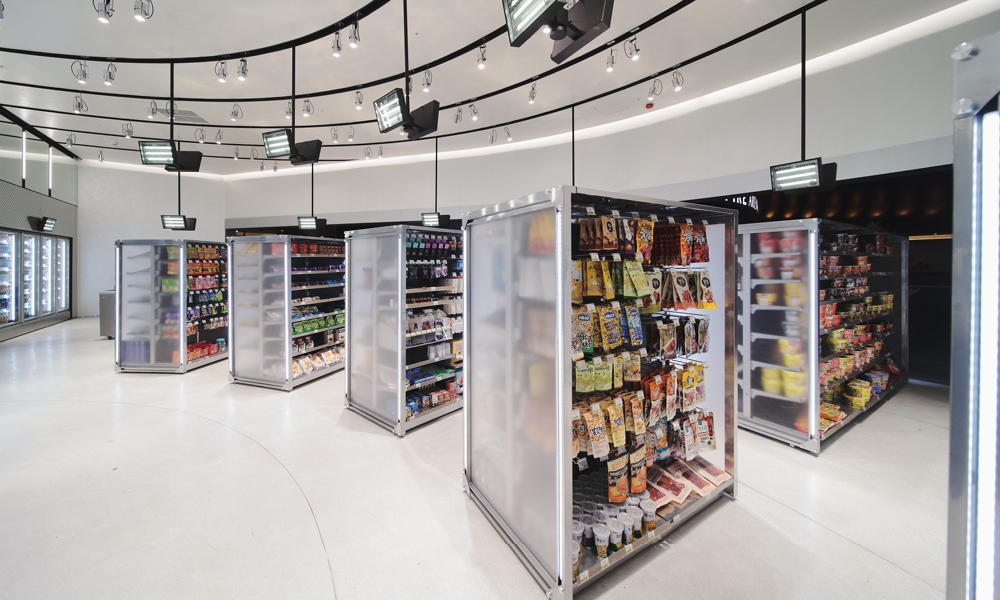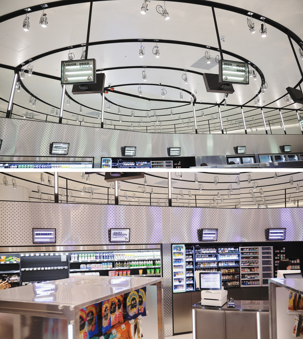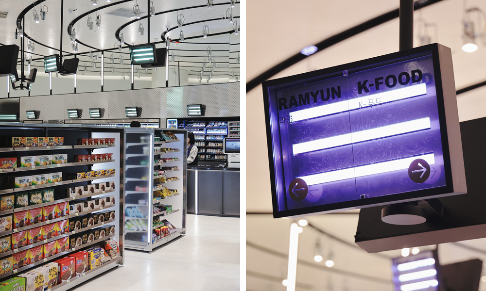 편리한 쇼핑을 돕는 장치는 또 있습니다. 점포 밖에서 안쪽을 들여다보면 상품 카테고리가 한눈에 싹 들어오는데요. 진열대끼리 시선이 겹치지 않는 것도 신기하지만 바로 위에 모니터 형태의 조명을 띄워 공간에 어울리는 미래 지향적인 감각까지 더했습니다.