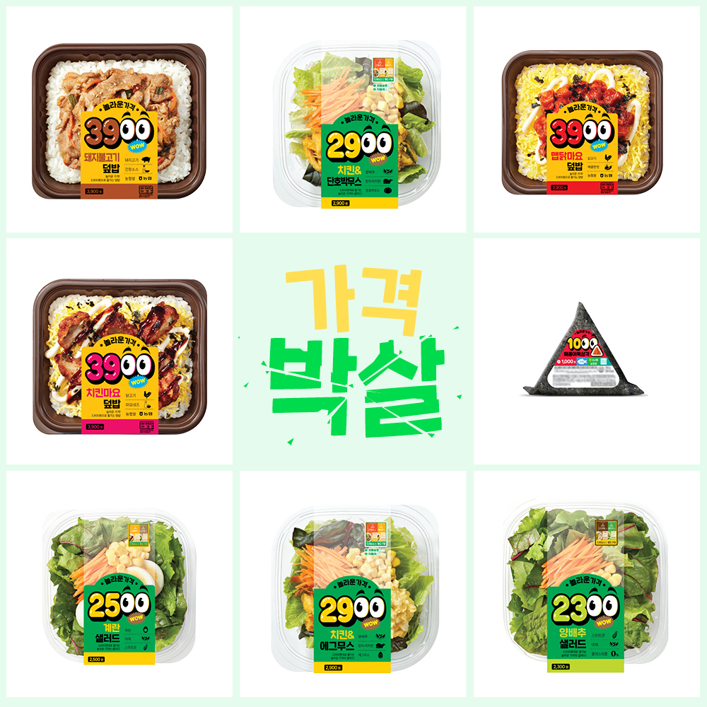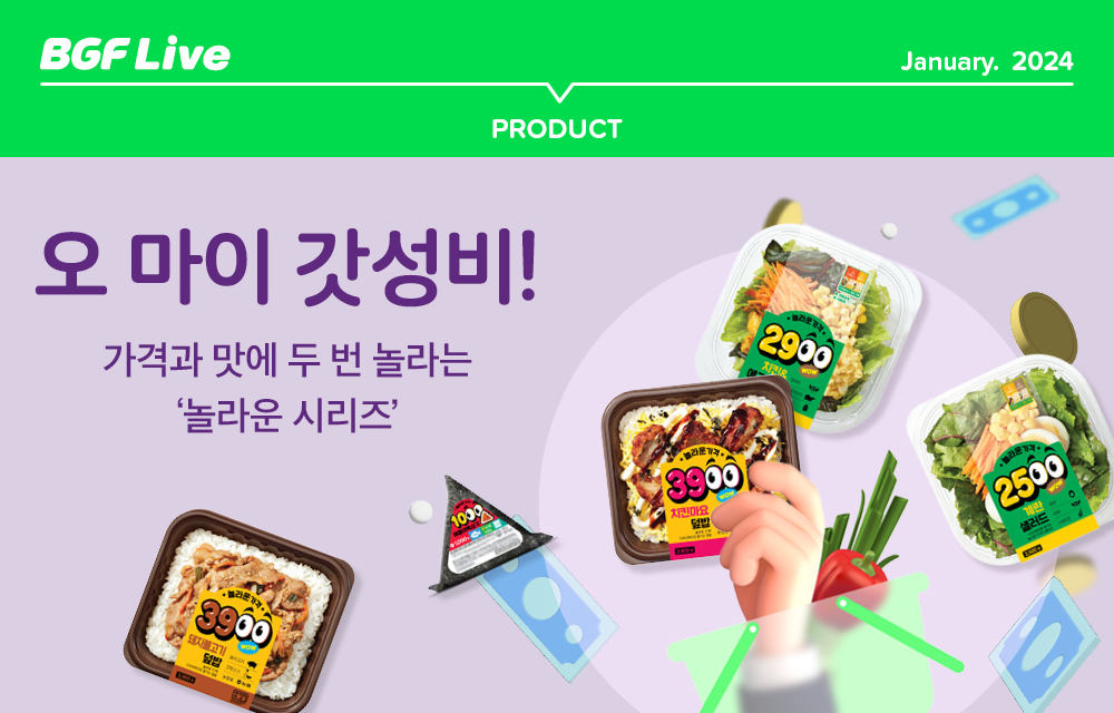 주머니 사정이 넉넉치 않은 사회 초년생들이나 학생들이 부담 없이 한 끼를 해결했으면 하는 바람에서 초저가 간편식의 기획은 시작되었습니다. 그리하여 천 원짜리 삼각김밥과 2천 원대 샐러드, 3천 원대 덮밥으로 구성된 놀라운 시리즈가 탄생했는데요. 2023년 11월, 놀라운 시리즈의 첫 주자인 샐러드 5종이 카테고리 내에서 매출 1위를 달성한 데 힘입어, 새해 첫 달 덮밥 3종, 샐러드 2종, 삼각김밥 1종을 새롭게 선보였습니다.