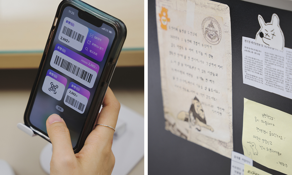 저도 CU에 이렇게 많은 서비스가 있는지 입사 후에 알았어요. (웃음). 요즘 CU에서 정말 많은 것들을 할 수 있잖아요. 택배도 보낼 수 있고, 싱싱한 회도 픽업할 수 있어요. 끊임없이 새로운 트렌드를 만들고 기술을 현장에서 적용해보는 등 언제나 앞서 나가려는 시도를 한다는 점이 포켓CU의 장점 같아요. 그 때문에 디자이너 입장에서는 도전적인 과제를 마주하게 될 때가 있죠. 해결할 때의 성취감도 크고요. (웃음)