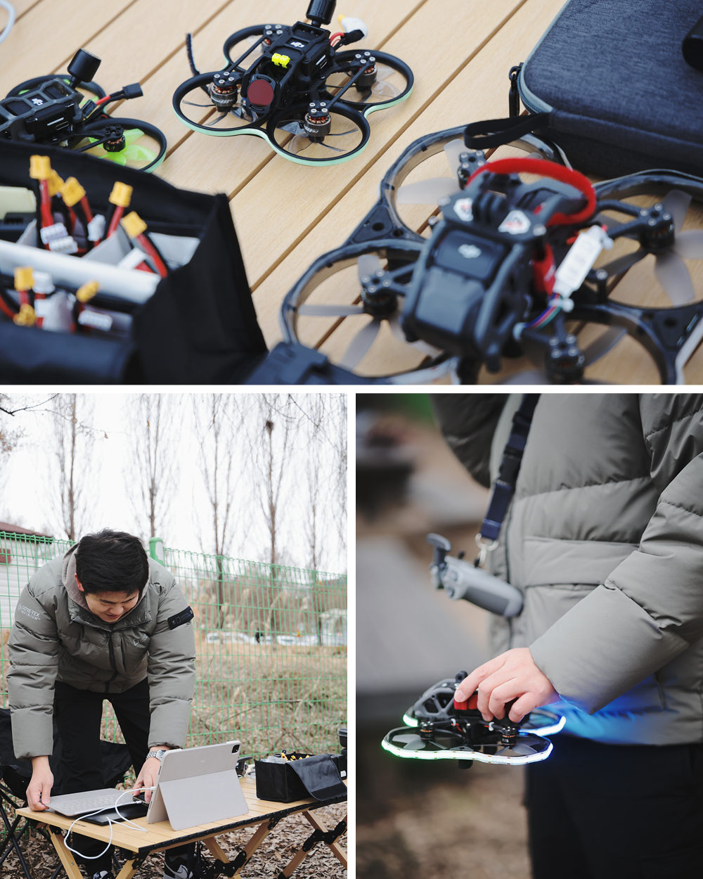 아무래도 장비가 고가이다 보니 우선 조종기만 사서 PC로 열심히 시뮬레이션만 했어요. (웃음) 어느 정도 익숙해진 뒤에는 ‘DJI AVATA’라는 기체를 사서 입문했죠. 처음에는 드론 카페에 가입해서 공부했고, 회원들과 오픈카톡방 사람들에게 물어보면서 익혔어요. 모임을 나가서 함께 조작하다 보니까 빠르게 익힐 수 있었던 것 같아요.